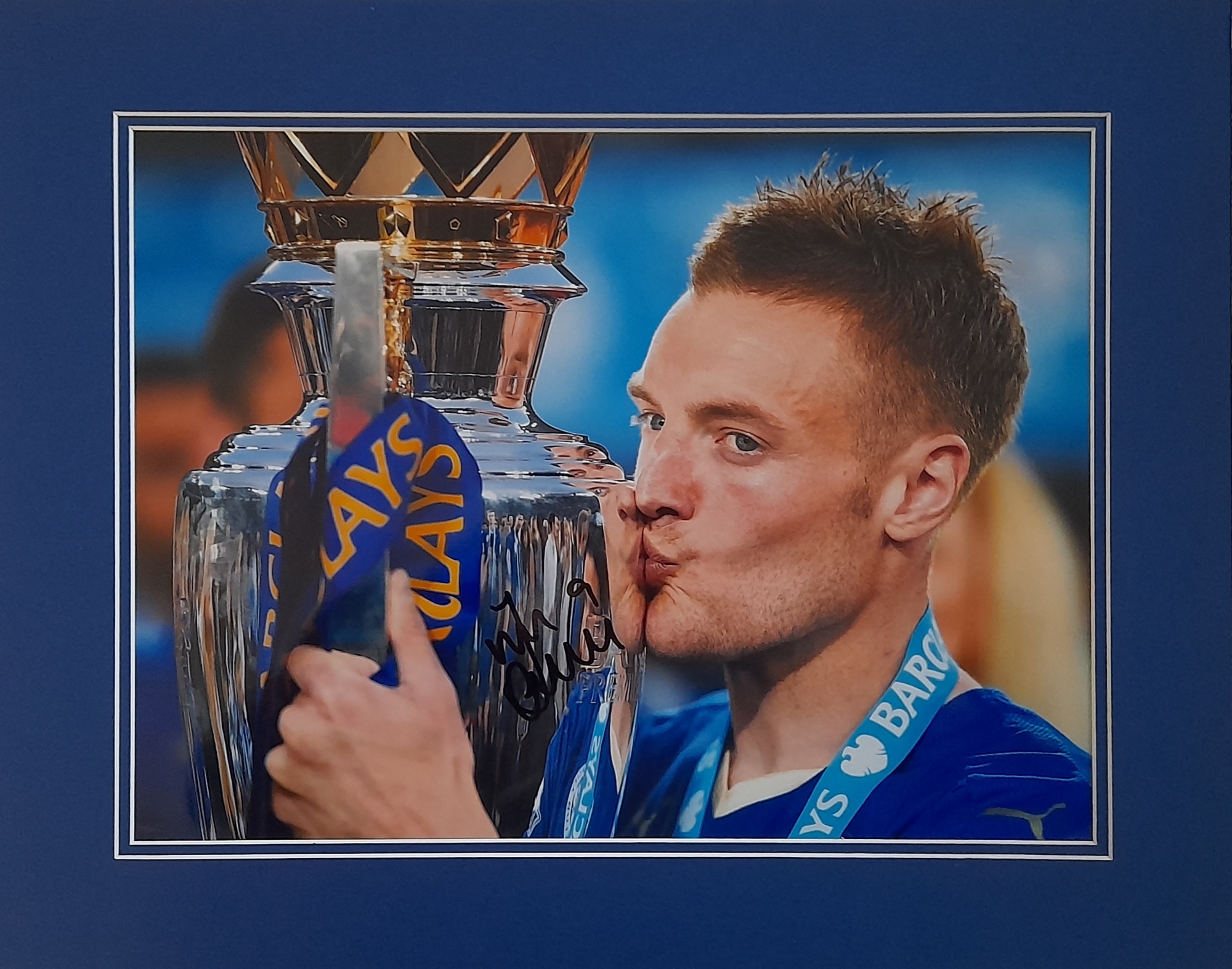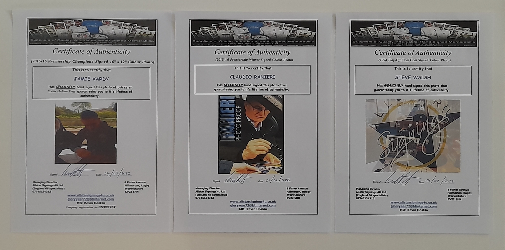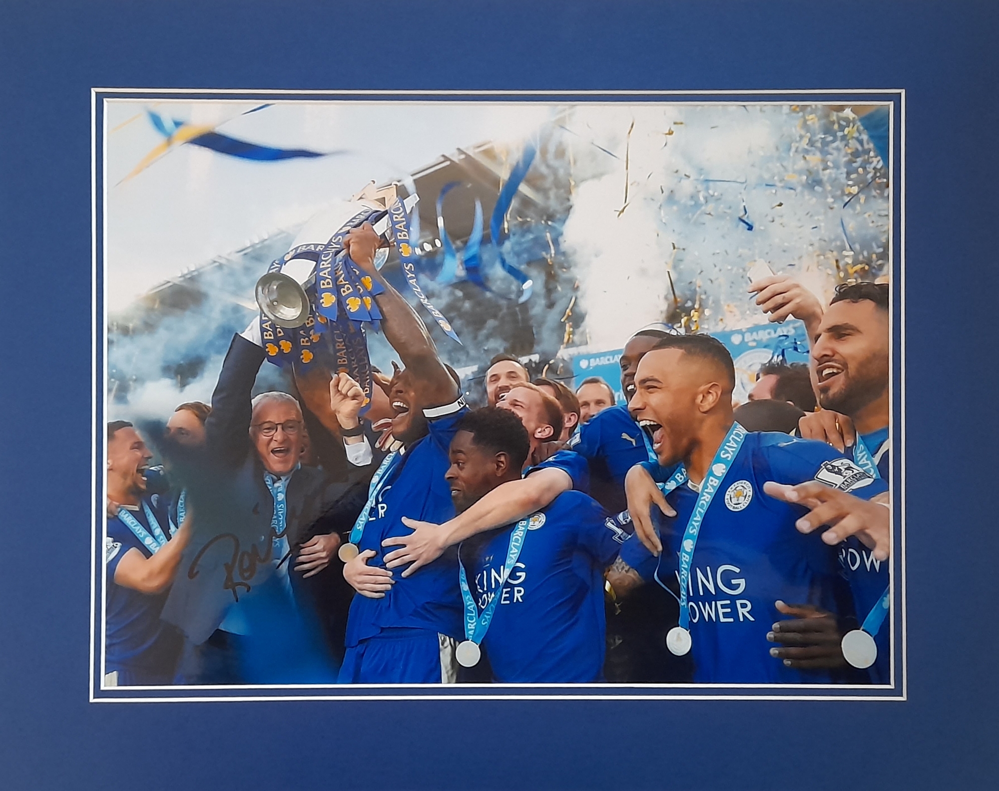 Leicester City signed colour photos various sizes all mounted ready to drop into frames, five of measuring 20 by 16in., and one at 12 by 10in., the larger ones Claudio Ranieri lifting 2015-16 Premiership trophy, Jamie Vardy kissing the 2015-16 Premiership trophy Shinji Okazaki soring overhead during the 2015-16 winning season and Steve Walsh celebrating after scoring against Swindon in the 1994 play-off final at Wembley to ensure Premier League football. The smaller signed photo features Leonardo Ulloa holding the 2015-16 Premiership trophy aloft, come with COA's and two photo proofs, (6)
