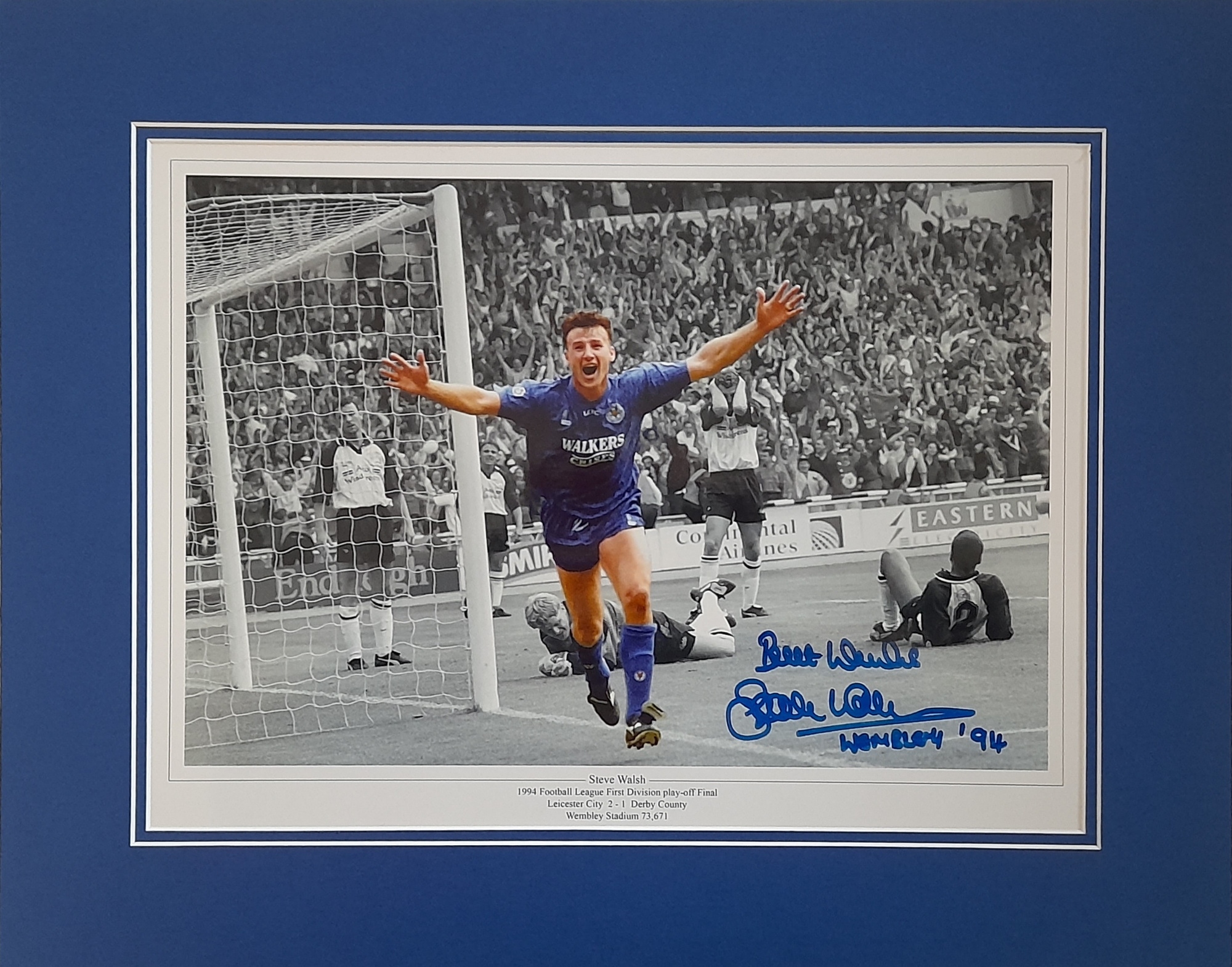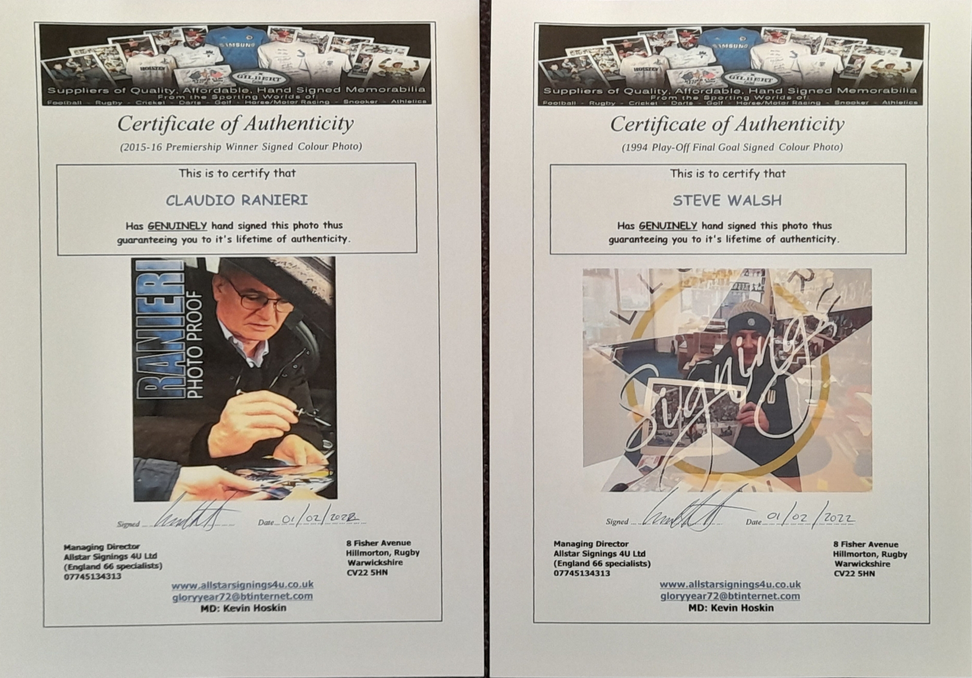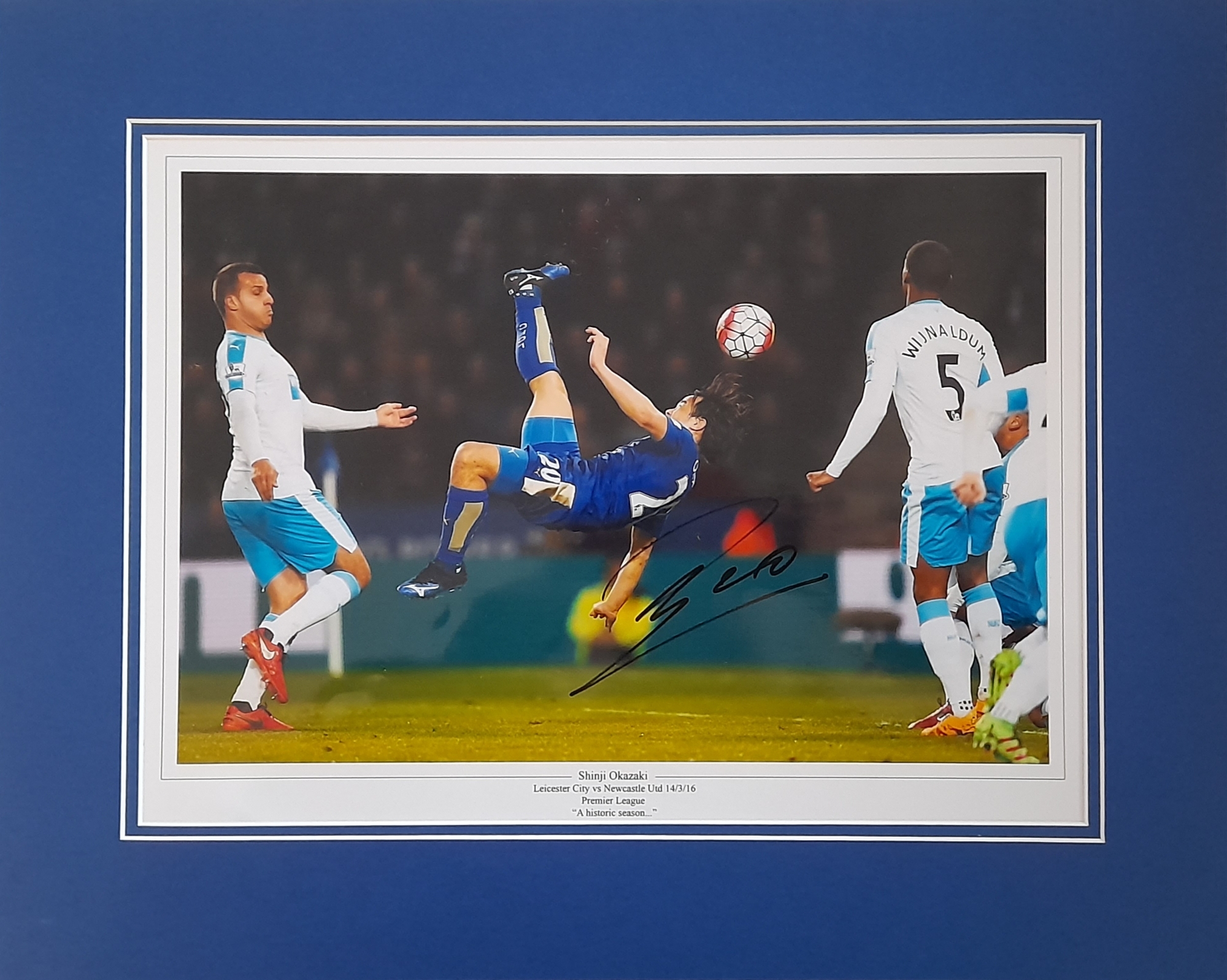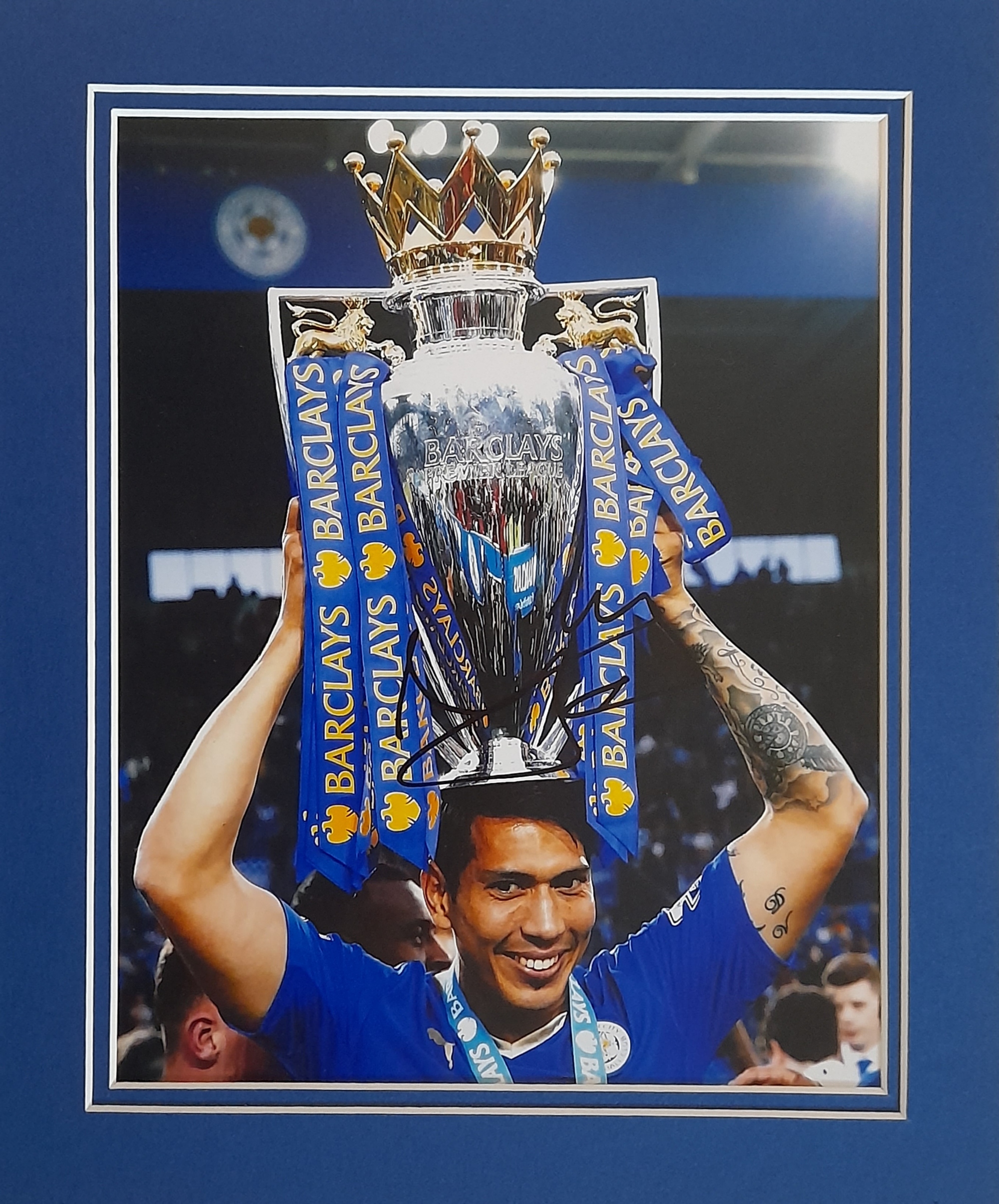 Leicester City signed colour photos various sizes all mounted ready to drop into frames, five of measuring 20 by 16in., and one at 12 by 10in., the larger ones Claudio Ranieri lifting 2015-16 Premiership trophy, Jamie Vardy kissing the 2015-16 Premiership trophy Shinji Okazaki soring overhead during the 2015-16 winning season and Steve Walsh celebrating after scoring against Swindon in the 1994 play-off final at Wembley to ensure Premier League football. The smaller signed photo features Leonardo Ulloa holding the 2015-16 Premiership trophy aloft, come with COA's and two photo proofs, (6)