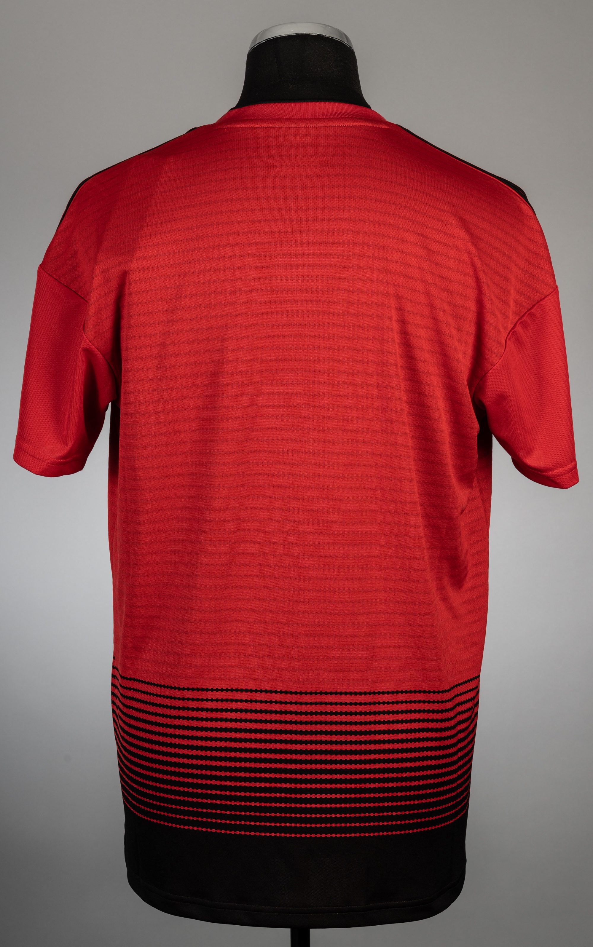 Squad signed red and black Manchester United replica shirt, season 2018-19, Adidas, short-sleeved with club crest and sponsor logo, signed in black m