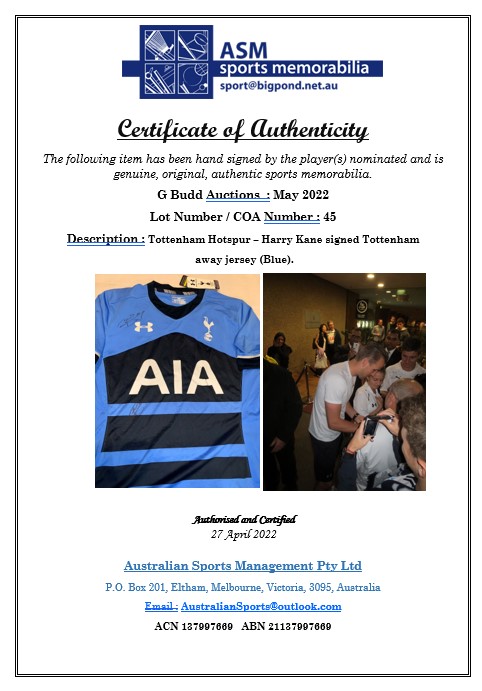 Harry Kane signed blue Tottenham Hotspur replica away jersey 2015-16, Under Armour, short-sleeved with club crest and sponsor logo, signed in marker pen on front, with retail tag and COA and photo proof