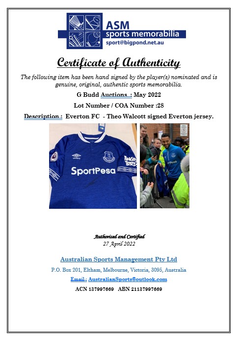 Theo Walcott signed blue Everton replica home jersey 2018-19, Umbro, short-sleeved with club crest and sponsor logo, signed in marker pen to front, with retail tag and COA and photo proof