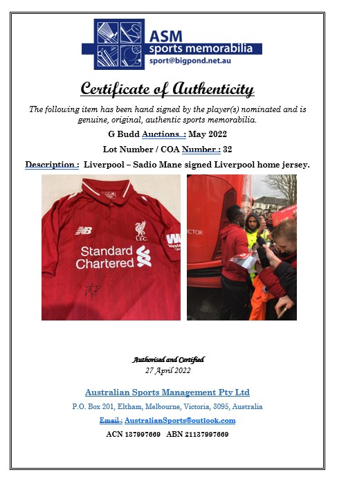 Sadio Mane signed red Liverpool replica home jersey 2018-19, New Balance, short-sleeved with club crest and sponsor logo, signed in marker pen on front, with COA and photo proof