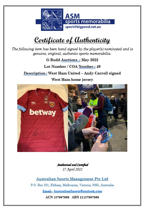 Andy Carroll signed claret and blue West Ham United replica home jersey 2018-19, Umbro, short-sleeved with club crest and sponsor logo, signed in marker pen on front, with retail tags and COA and photo proof