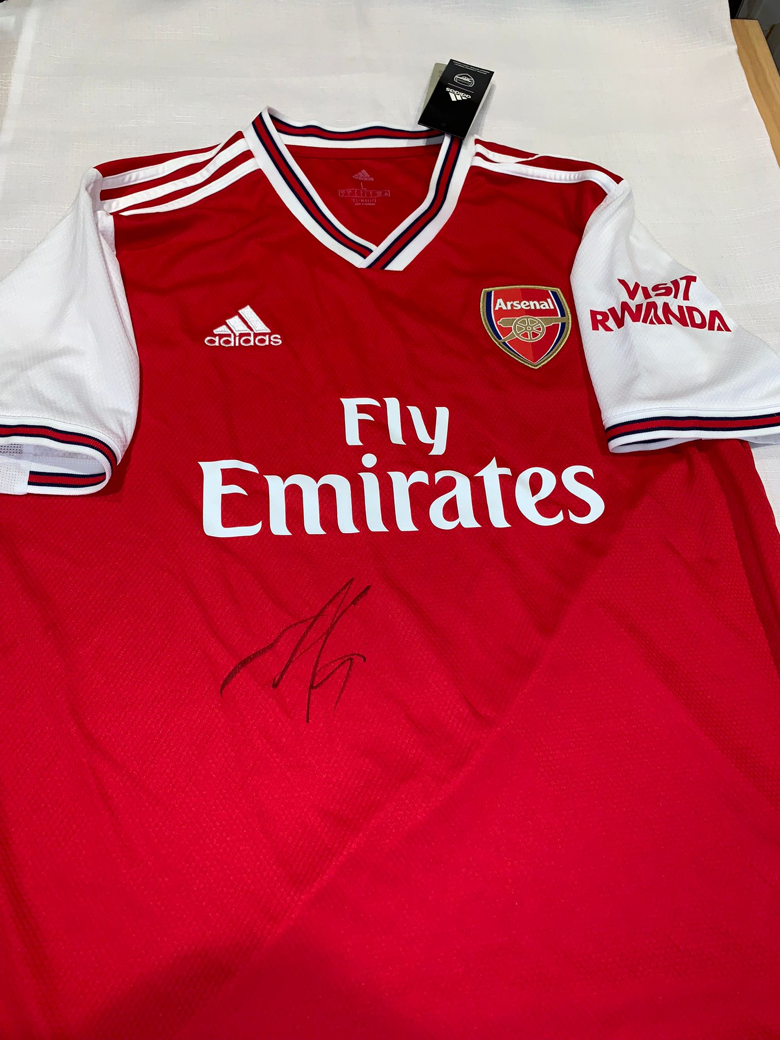 Alexandre Lacazette signed red and white Arsenal replica home jersey 2019-20, Adidas, short-sleeved with club crest and sponsor logo, signed in marker pen to front, with retail tag and COA and photo proof