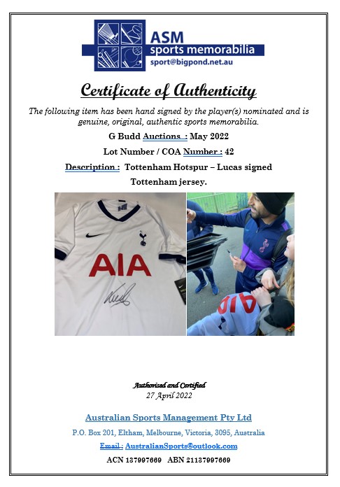 Lucas Moura signed white Tottenham Hotspur replica home jersey 2019-20, Nike, short-sleeved with club crest and sponsor logo, signed in marker pen on front, with retail tag and COA and photo proof