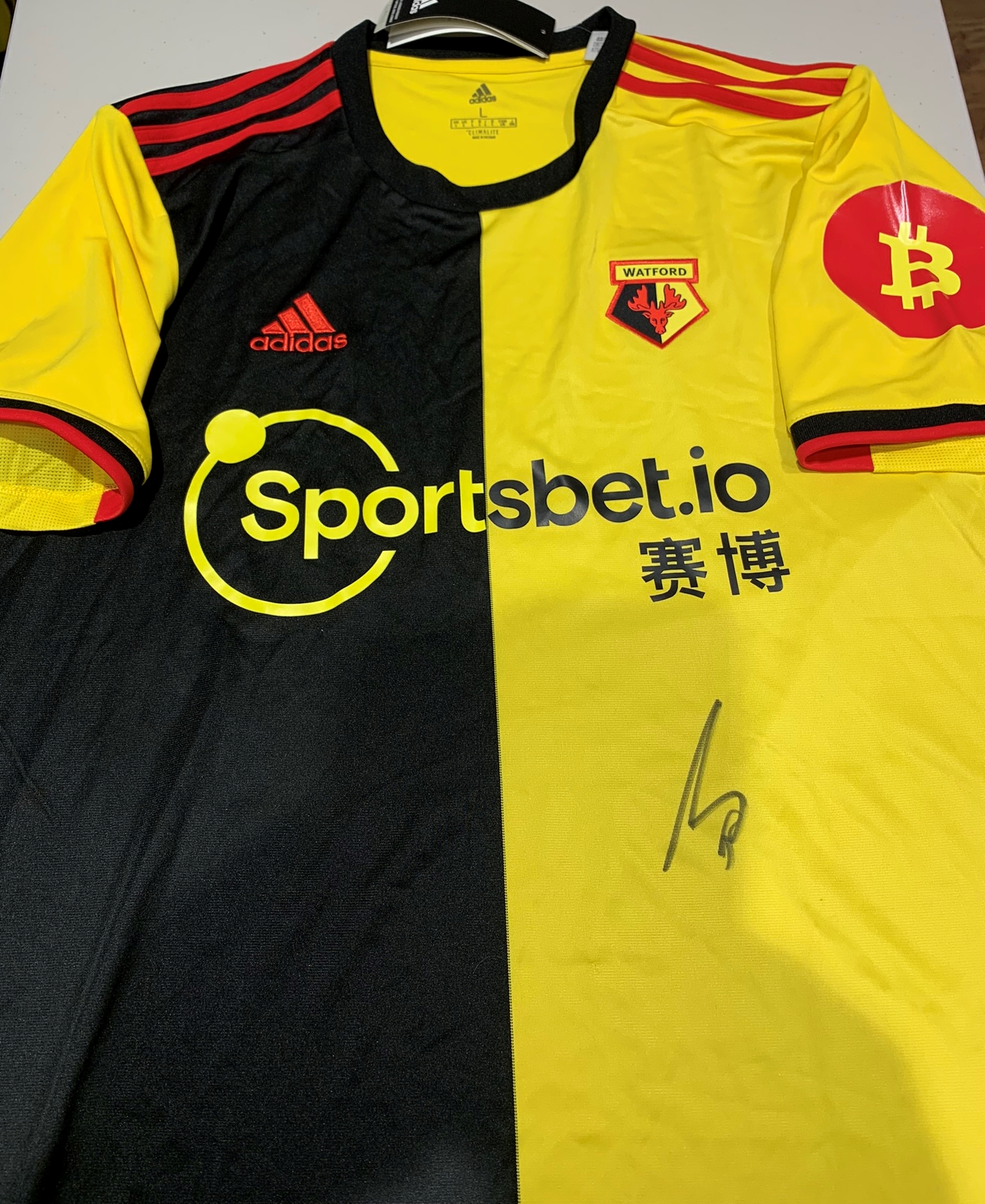 Troy Deeney signed yellow and black Watford replica jersey 2019-20, Adidas, short-sleeved with club crest and sponsor logo, signed in marker pen on f