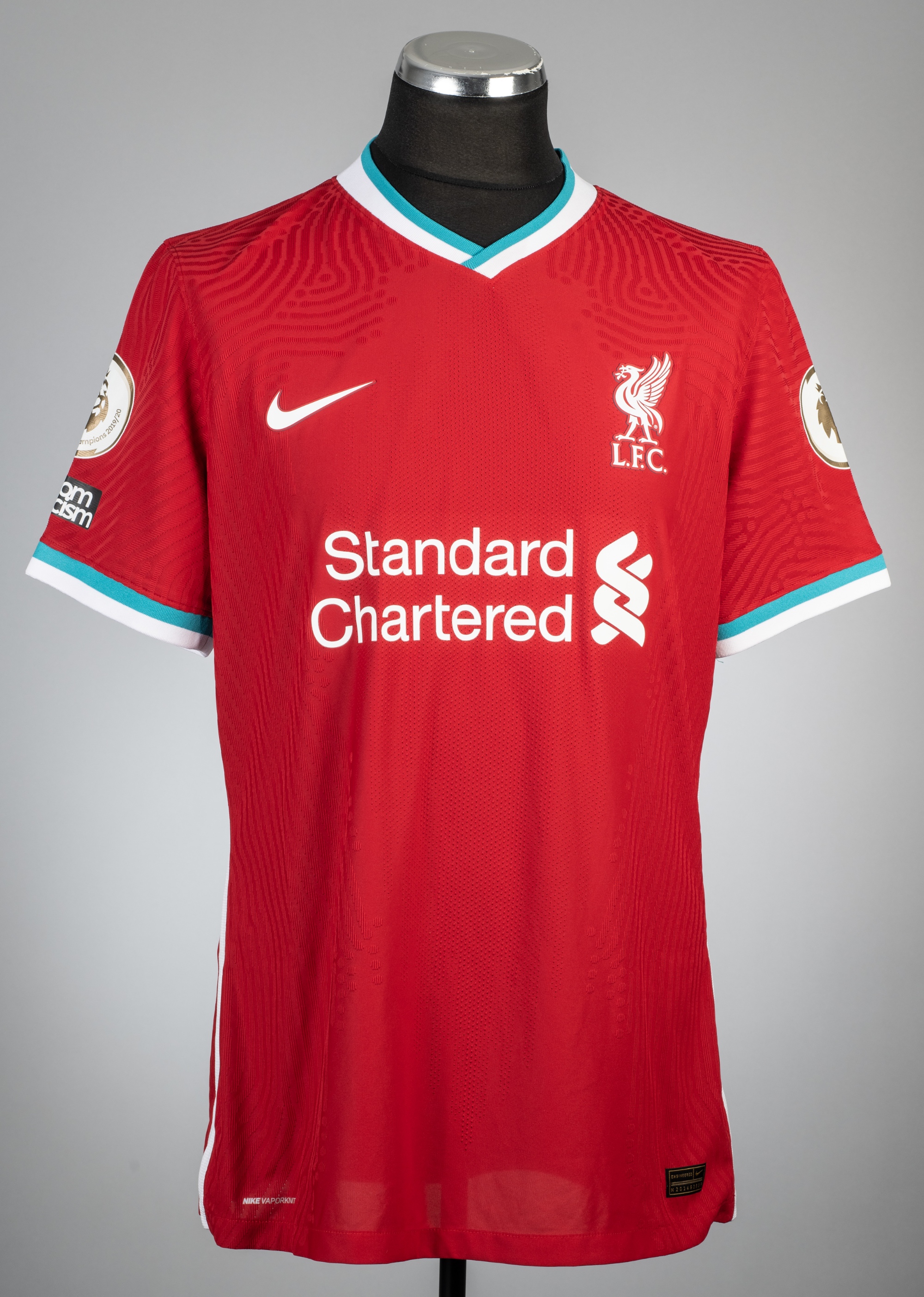 Virgil van Dijk red Liverpool no.4 home jersey worn in the match v Arsenal 28th September 2020, Nike, short-sleeved with PREMIER LEAGUE CHAMPIONS 2019-20 and NO ROOM FOR RACISM sleeve badges, club crest and sponsor logo, reverse lettered VIRGIL, size XL
