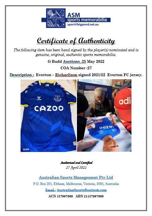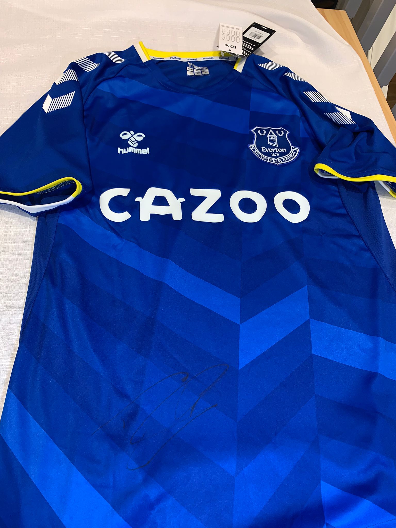 Richarlison de Andrade signed blue Everton replica home jersey, season 2021-22, Hummel, short-sleeved with club crest and sponsor logo, signed in marker pen on front, with retail tag and COA and photo proof