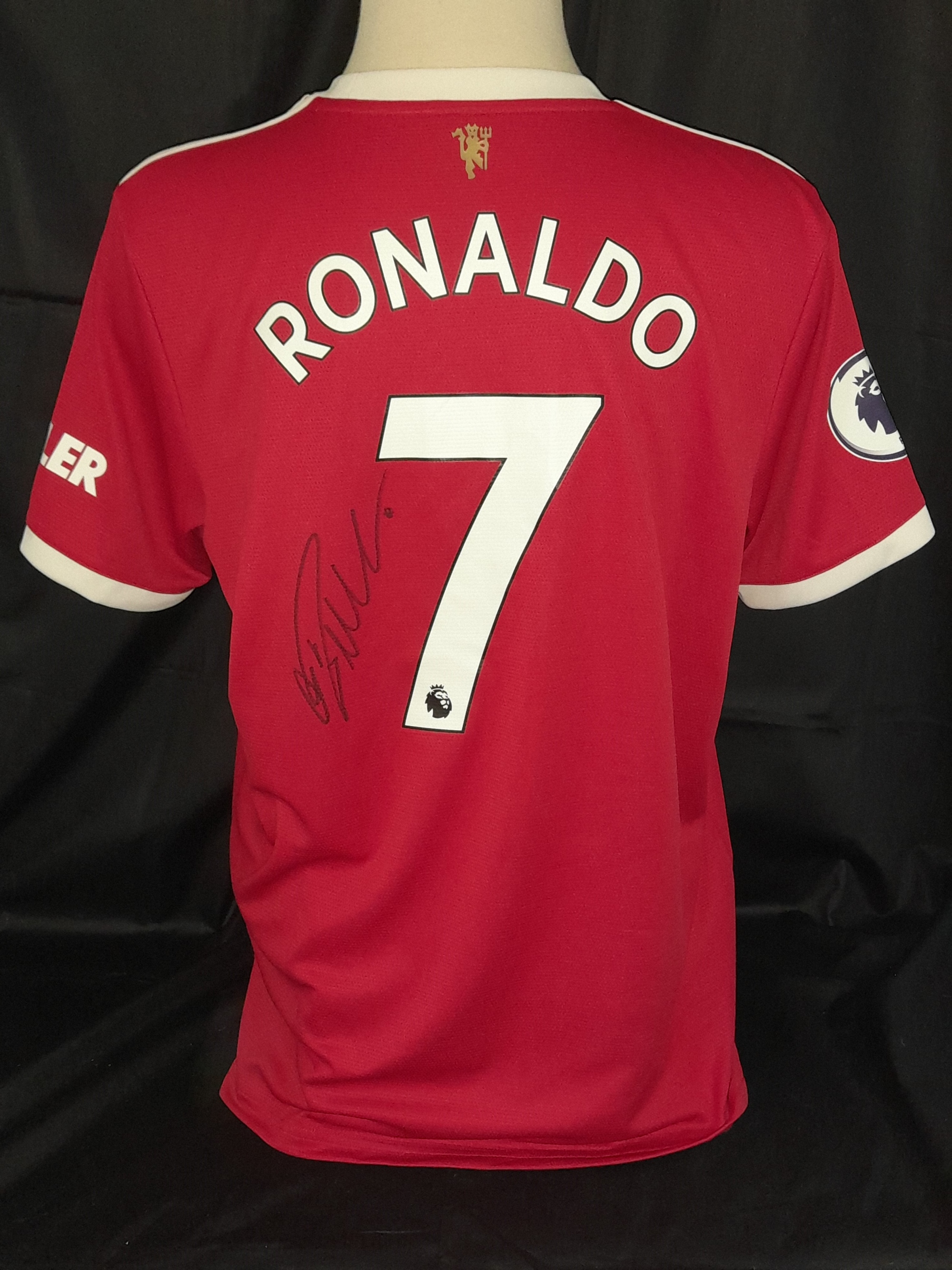 Cristiano Ronaldo CR7 autographed red Manchester United no.7 replica home jersey, season 2021-22, brand new with adidas tags still attached, signed by Cristiano neatly and boldly below his No7 on rear of shirt upon re-joining the Old Trafford club