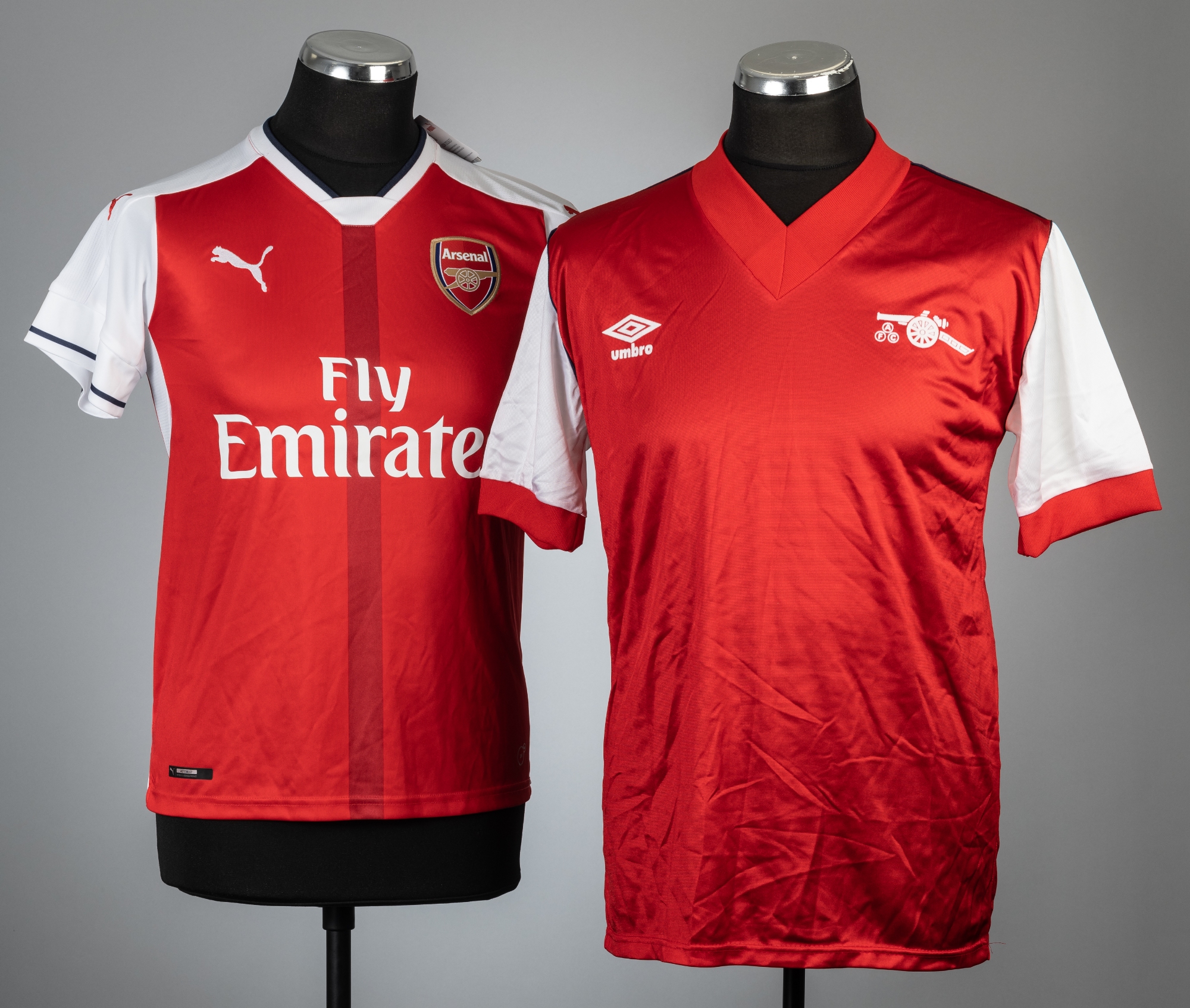 Two Arsenal replica jerseys, comprising red and white Arsenal replica jersey, season 1982-83, Umbro, short-sleeved with applied felt club crest and Umbro logo, un-numbered, neck label removed; sold together with red and white Arsenal child's replica jersey, season 2016-17, Puma, short-sleeved with club crest badge and sponsor logo, un-numbered, size 13-14Y, bears shop tag labels, (2)