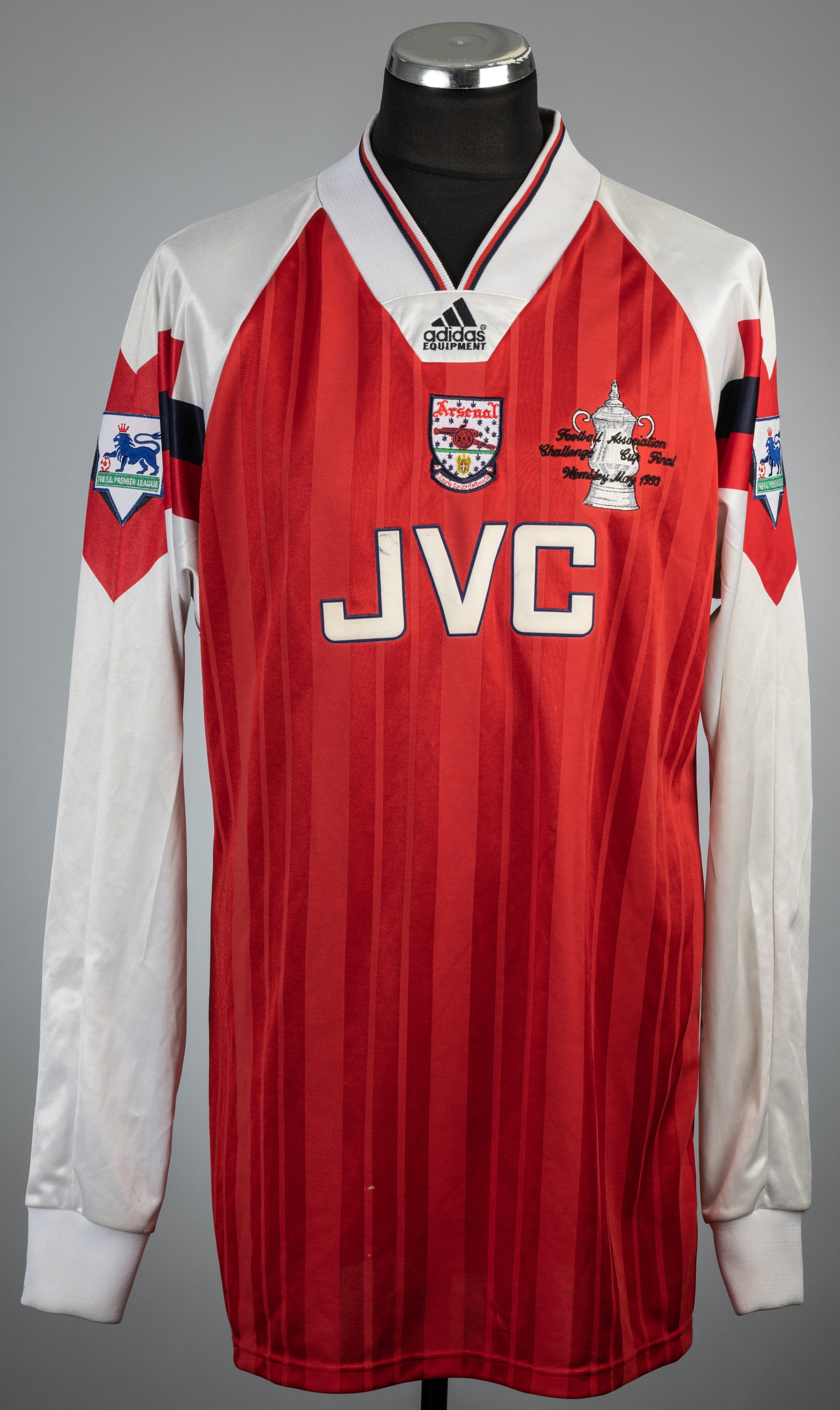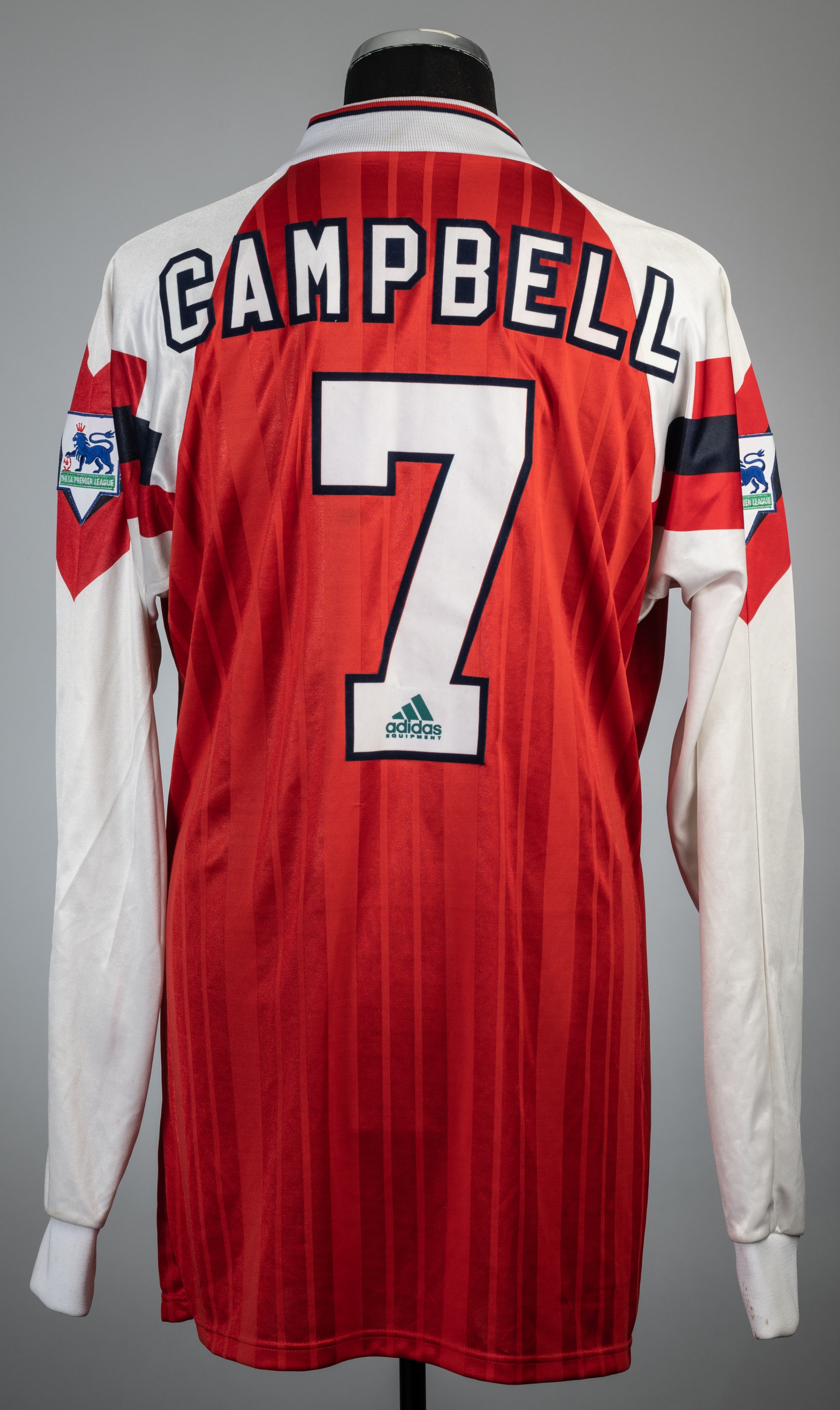 Kevin Campbell red Arsenal F.A. Cup Final No.7 jersey v Sheffield Wednesday, played at Wembley, 15th May 1993, Adidas, un-used long-sleeved spare with THE F.A. PREMIER LEAGUE sleeve badges, embroidered club crest, FOOTBALL ASSOCIATION CHALLENGE CUP FINAL WEMBLEY MAY 1993 and trophy emblem, sponsor logo, reverse lettered CAMPBELL, size 42-44in., signs of staining on right cuff and white in jersey not brilliant white slightly discoloured Arsenal defeated Sheffield Wednesday 2-1 in the replay (20th May) of the original final, which took place at Wembley on 15th May 1993. Kevin Campbell played in both final's wearing the number 7 short-sleeved jersey.