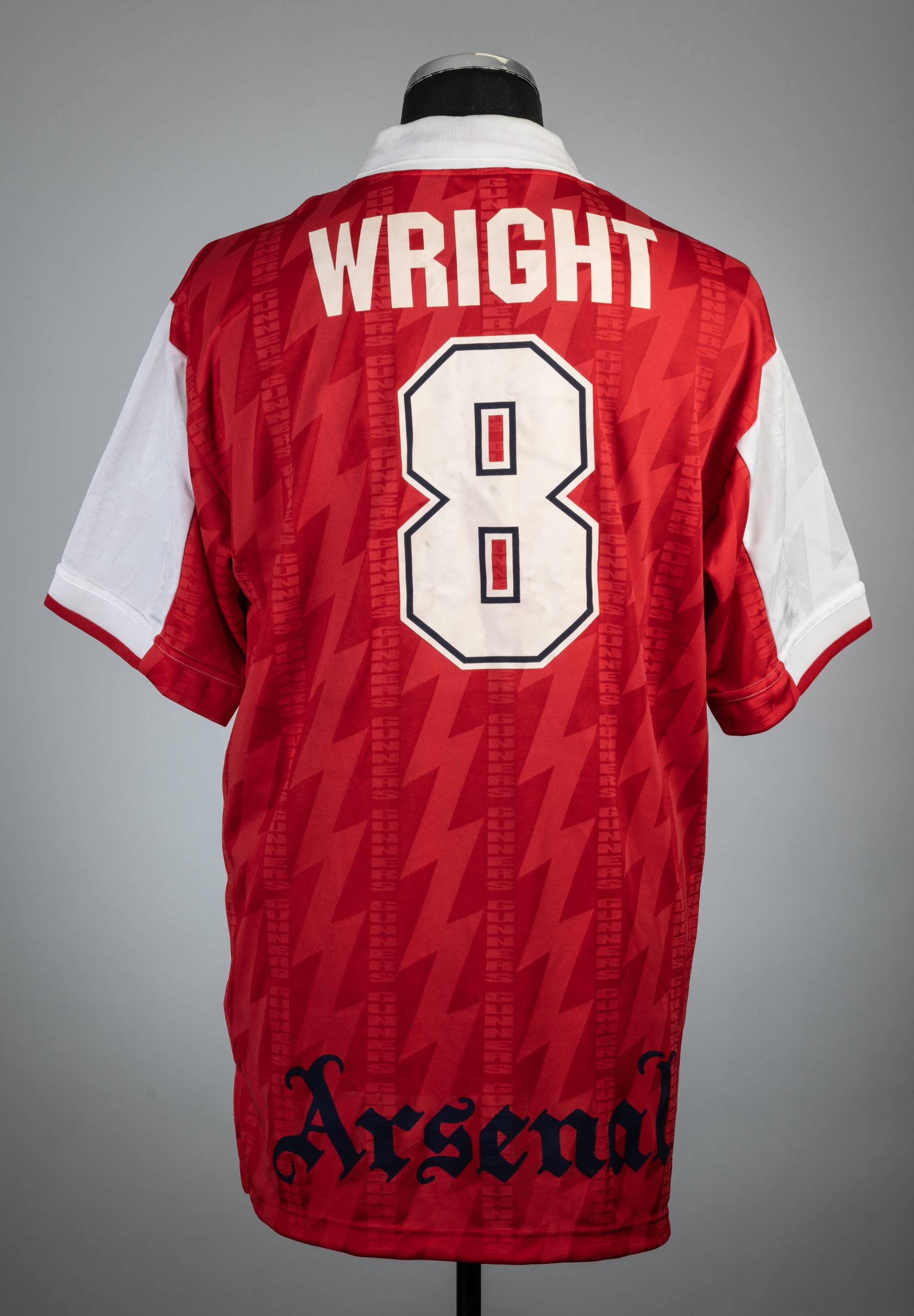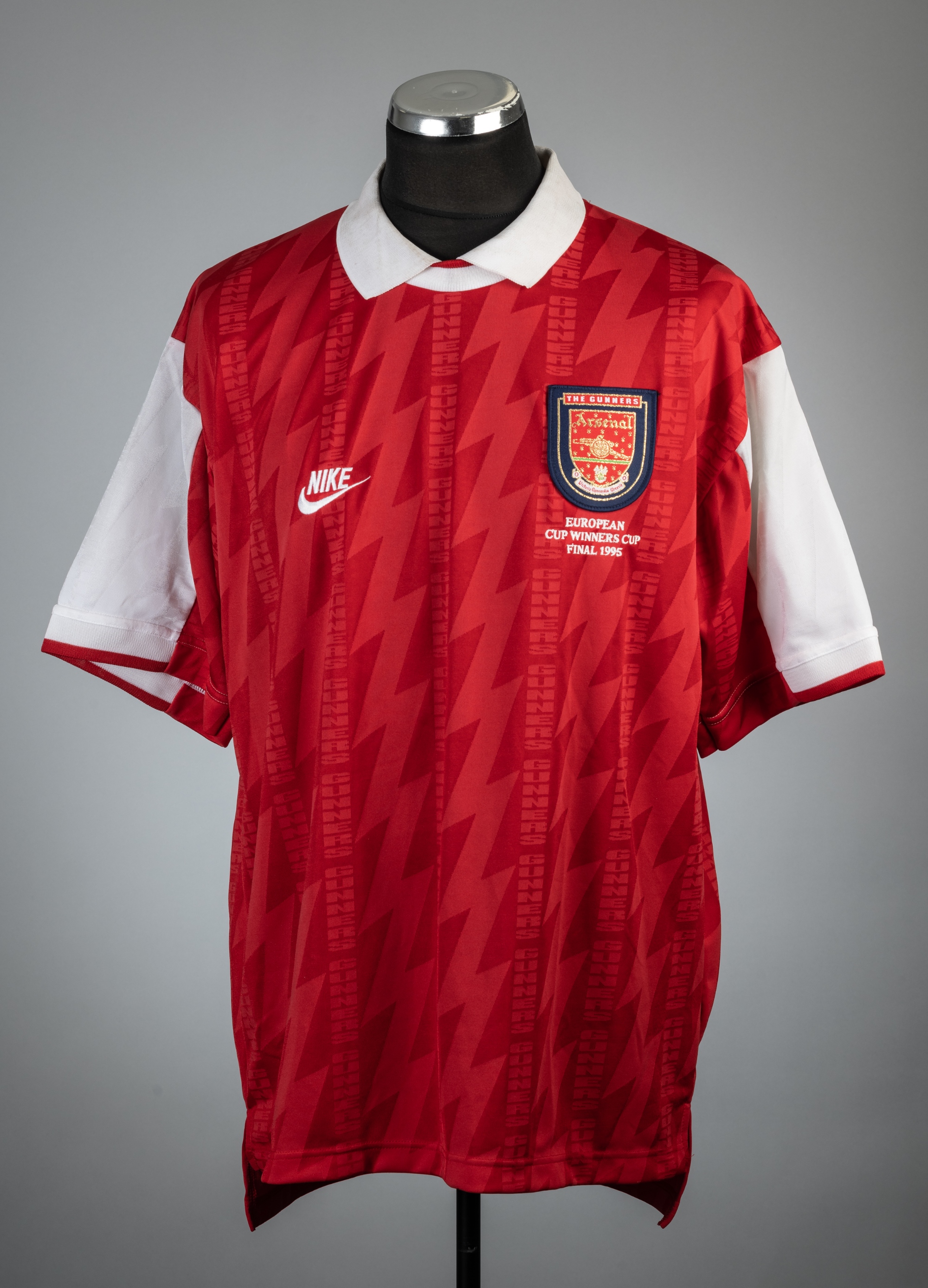 Ian Wright red Arsenal UEFA European Cup Winners' Cup Final No.8 jersey v Zaragoza, played at Parc des Princes Paris, 10th May 1995, Nike, short-sleeved with THE GUNNERS club crest badge, embroidered EUROPEAN CUP WINNERS CUP FINAL 1995, reverse lettered WRIGHT and ARSENAL, size XL, bears signs of dirt and discolouration on white collar and white number 8 on reverse Zaragoza defeated Arsenal 2-1.