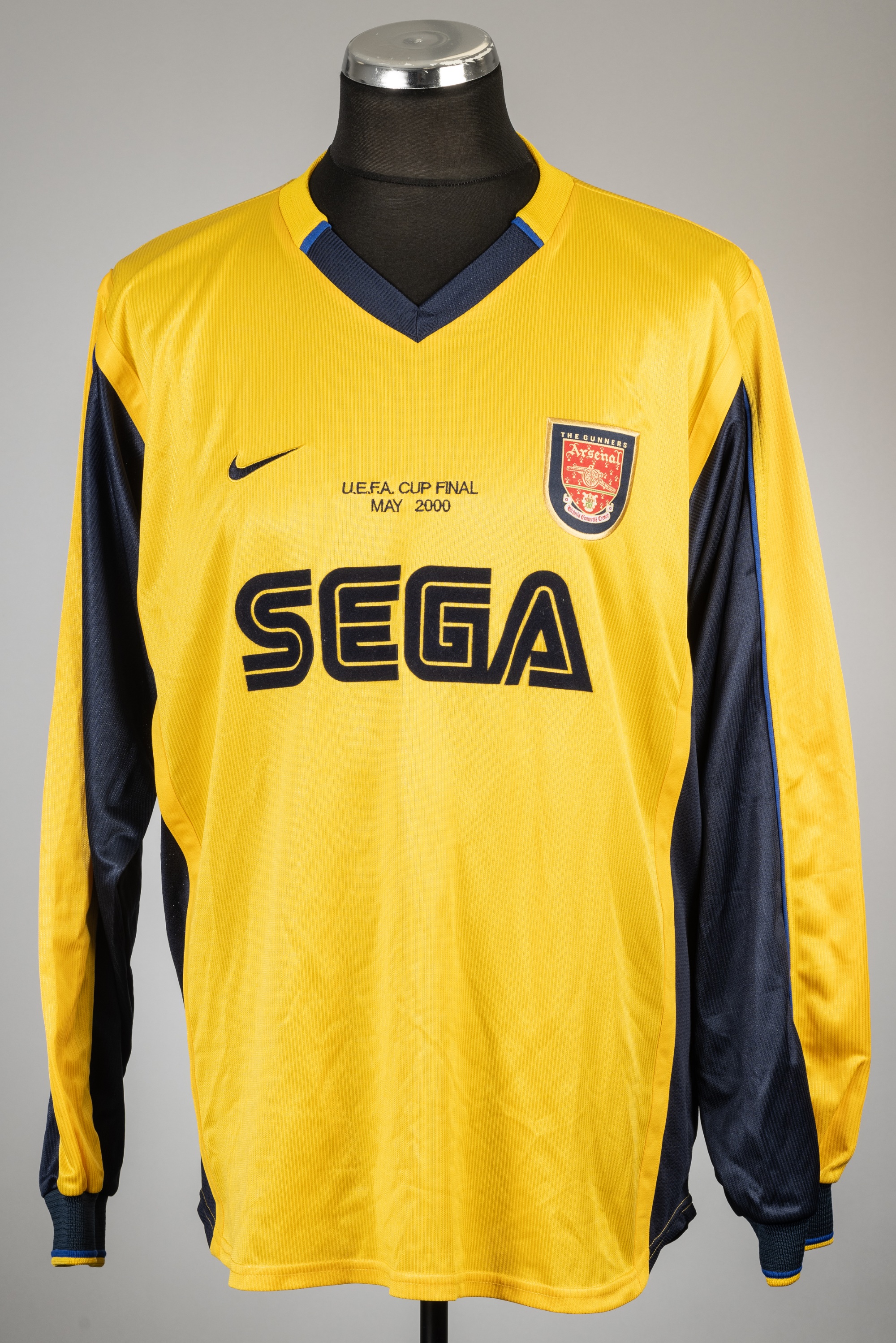 Yellow and navy Arsenal UEFA Cup final un-numbered jersey v Galatasaray, played at Parken Stadium, Copenhagen, 17th May 2000, Nike, long-sleeved with No sleeve badges, club crest, embroidered UEFA CUP FINAL MAY 2000 and sponsor logo, size XL Galatasaray defeated Arsenal 4-1 on penalties.