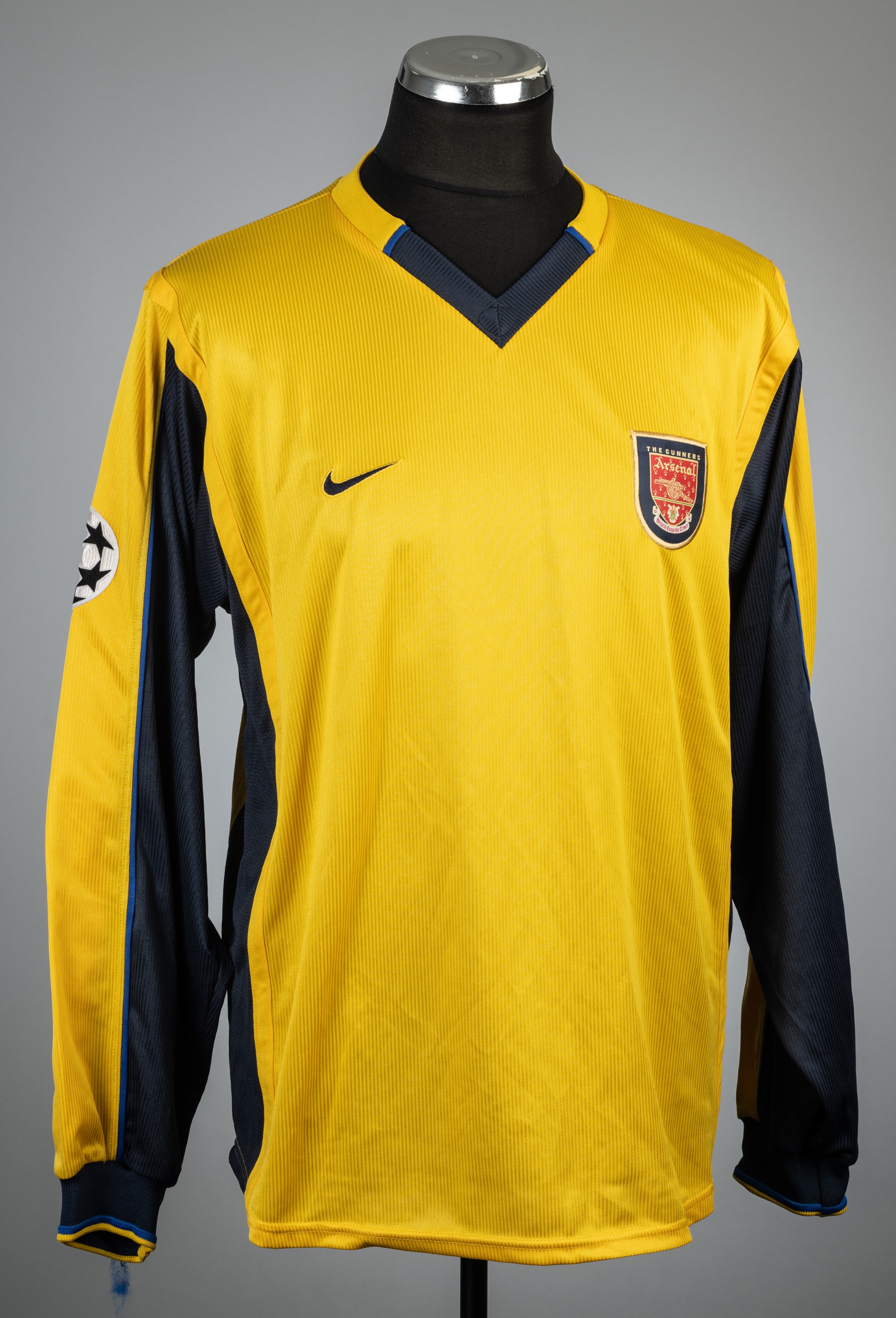 Thierry Henry yellow and navy Arsenal UEFA Champions League no.14 away jersey, season 2000-01, Nike, long-sleeved with UEFA STARBALL sleeve badge, cl