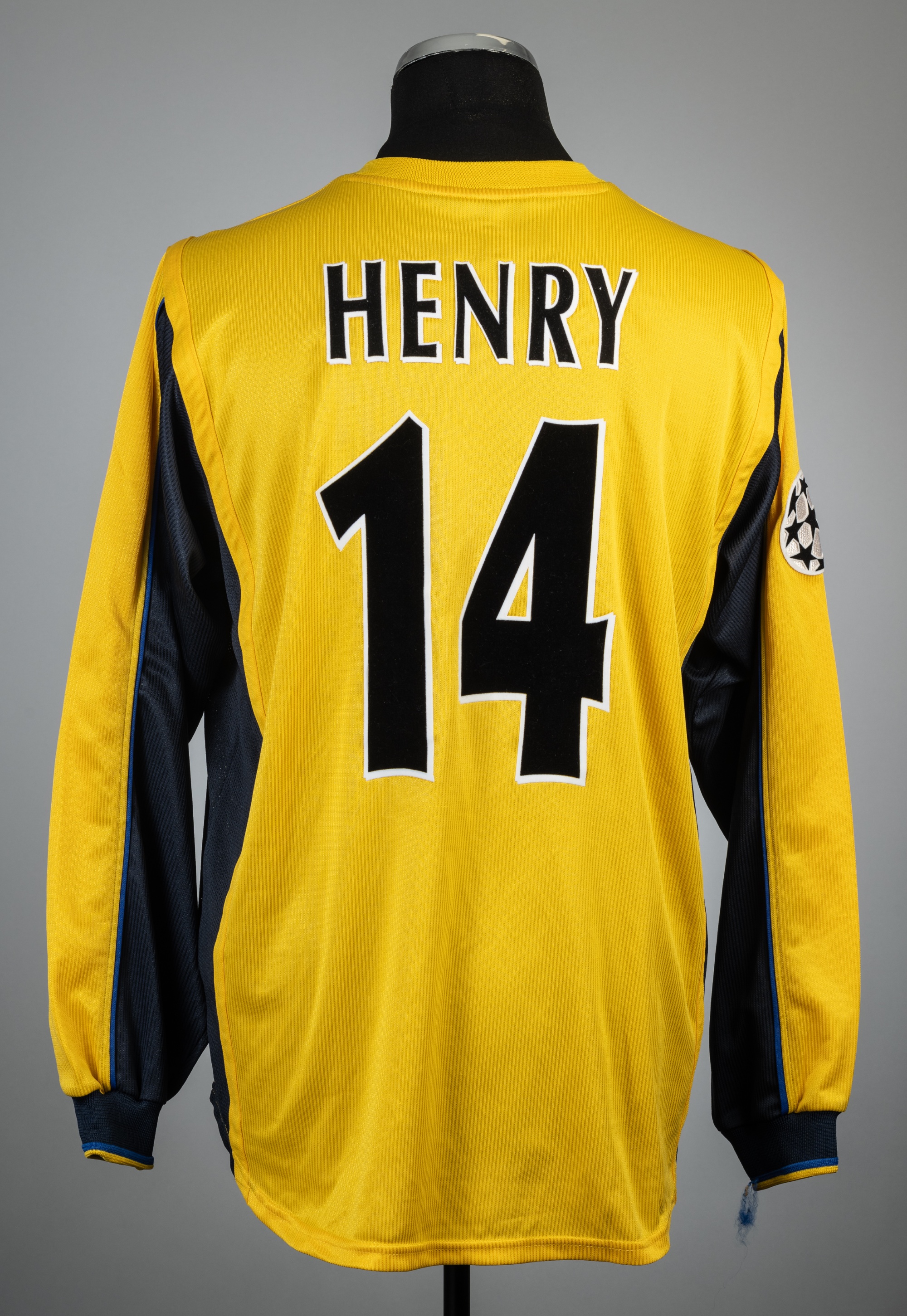 Thierry Henry yellow and navy Arsenal UEFA Champions League no.14 away jersey, season 2000-01, Nike, long-sleeved with UEFA STARBALL sleeve badge, club crest, reverse lettered HENRY, size XL