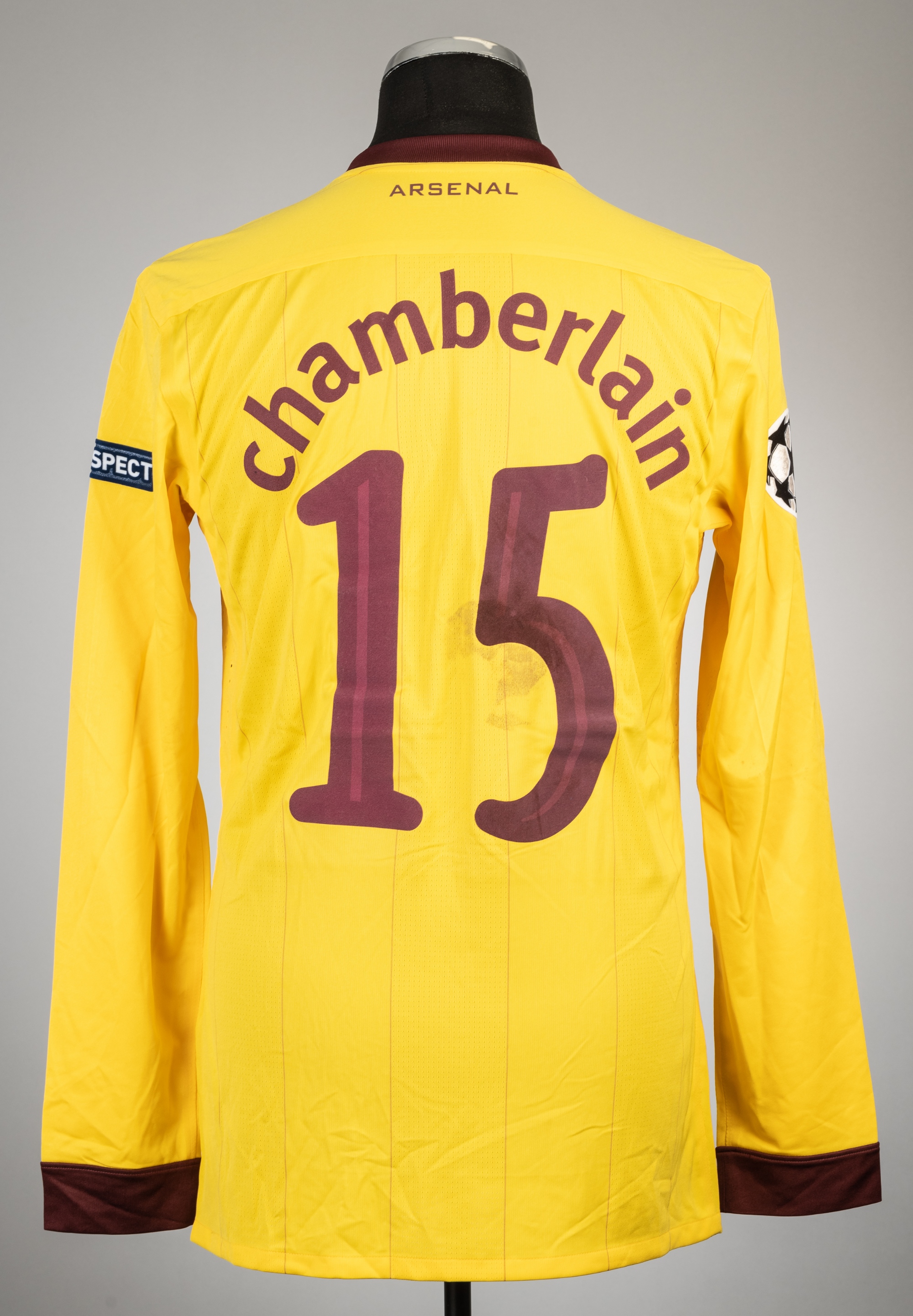 Alex Oxlade-Chamberlain yellow Arsenal no.15 third choice jersey, season 2011-12, Nike, long-sleeved with UEFA STARBALL and RESPECT sleeve badges, club crest and sponsor logo, reverse lettered CHAMBERLAIN, size M, bears pitch mark to reverse and slight marks on sleeves