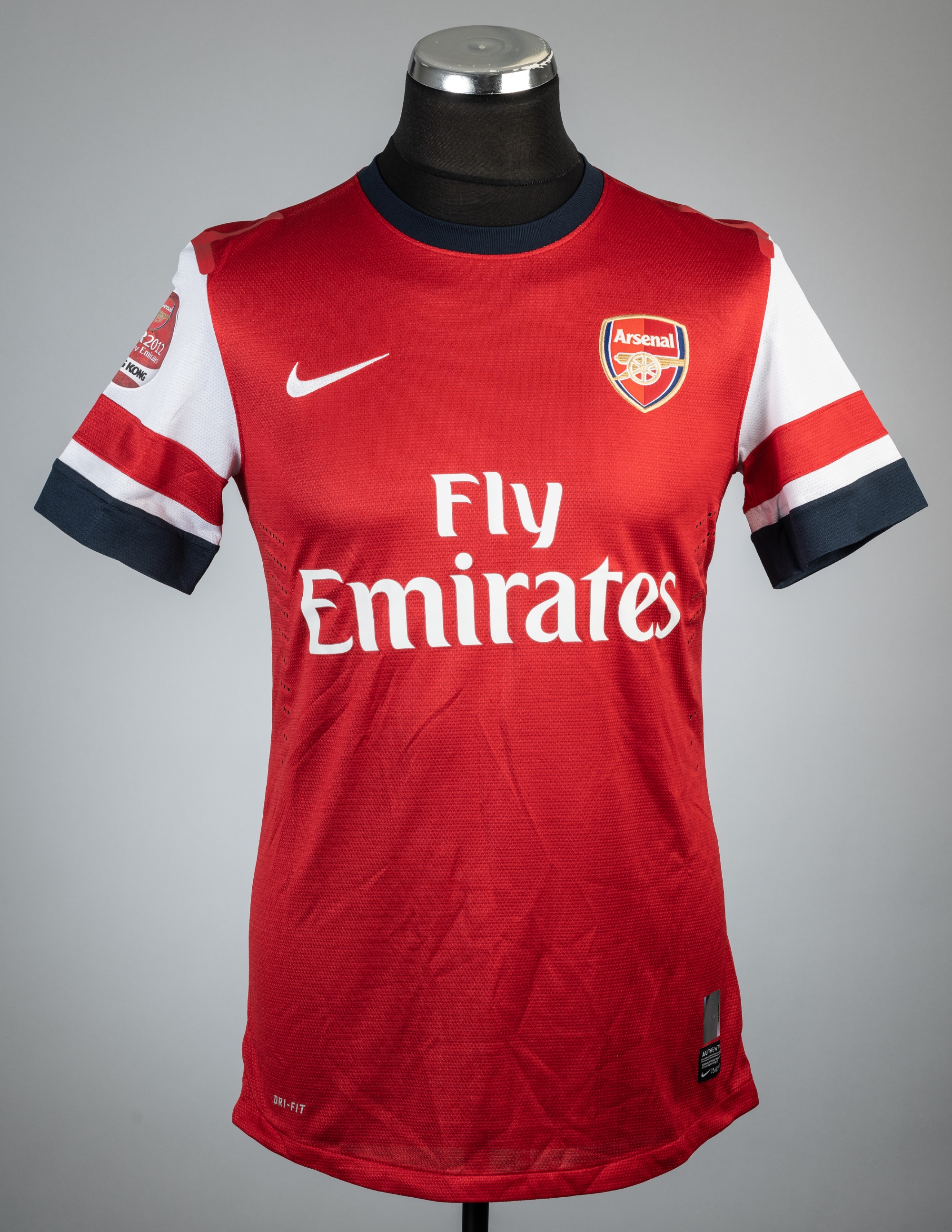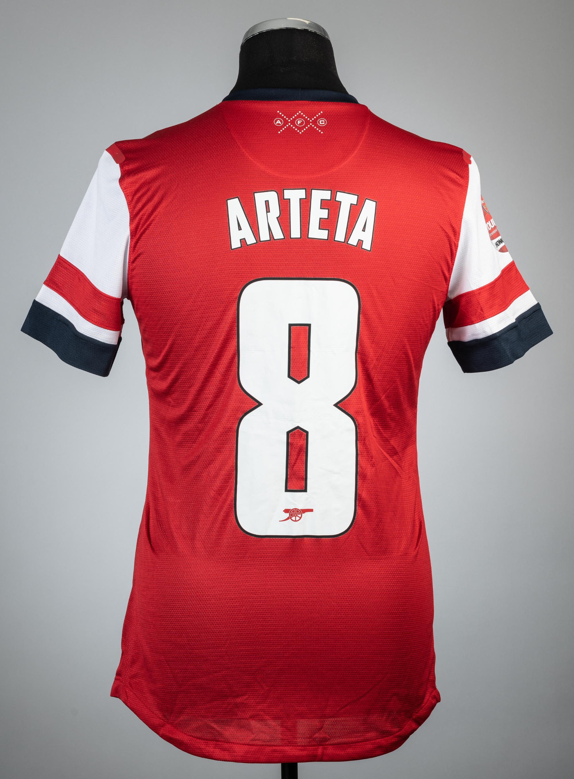 Mikel Arteta red Arsenal Asia tour 2012 no. 8 jersey, July 2012 Nike, short-sleeved with ARSENAL TOUR 2012 PRESENTED BY EMIRATES HONG KONG sleeve badge, club crest and sponsor logo, reverse lettered ARTETA, size M, wear to number on reverse
