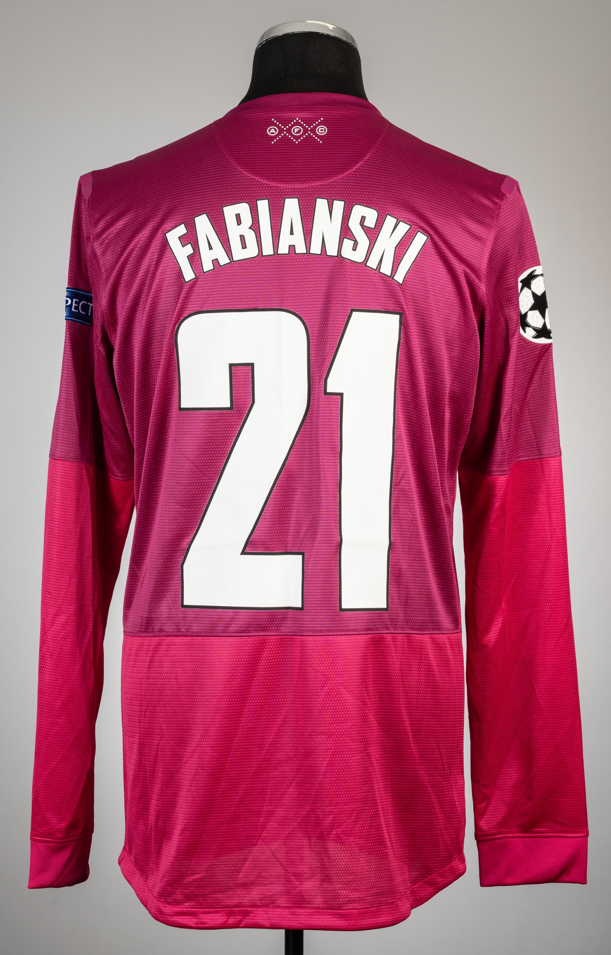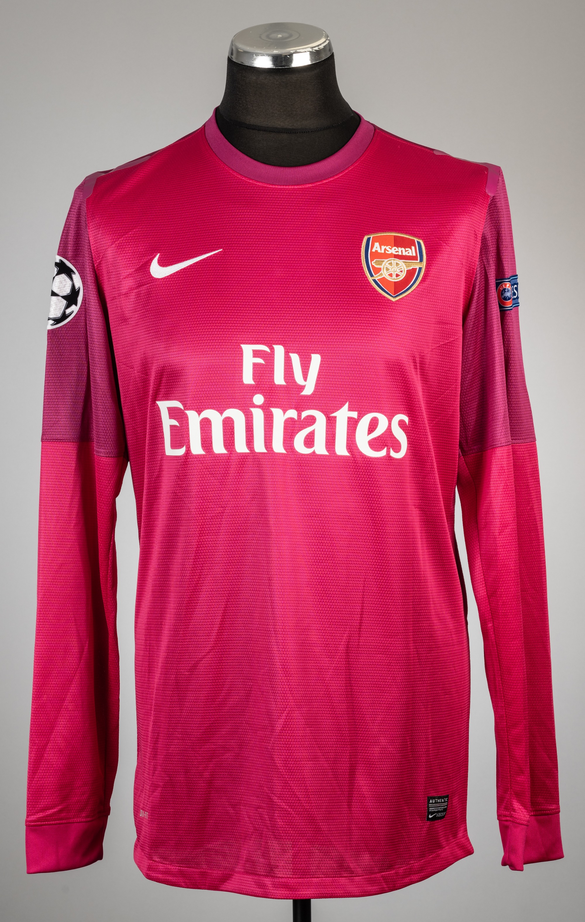 Lukasz Fabianski pink Arsenal no.21 goalkeeper's away jersey, season 2012-13, Nike, long-sleeved with UEFA STARBALL and RESPECT sleeve badges, club crest and sponsor logo, reverse lettered FABIANSKI, size L, rubberised shoulder seams are tacky
