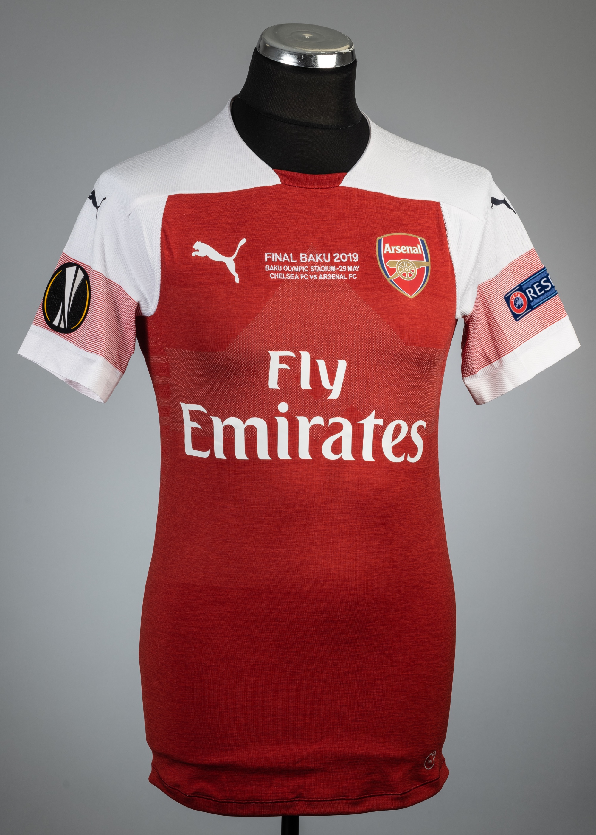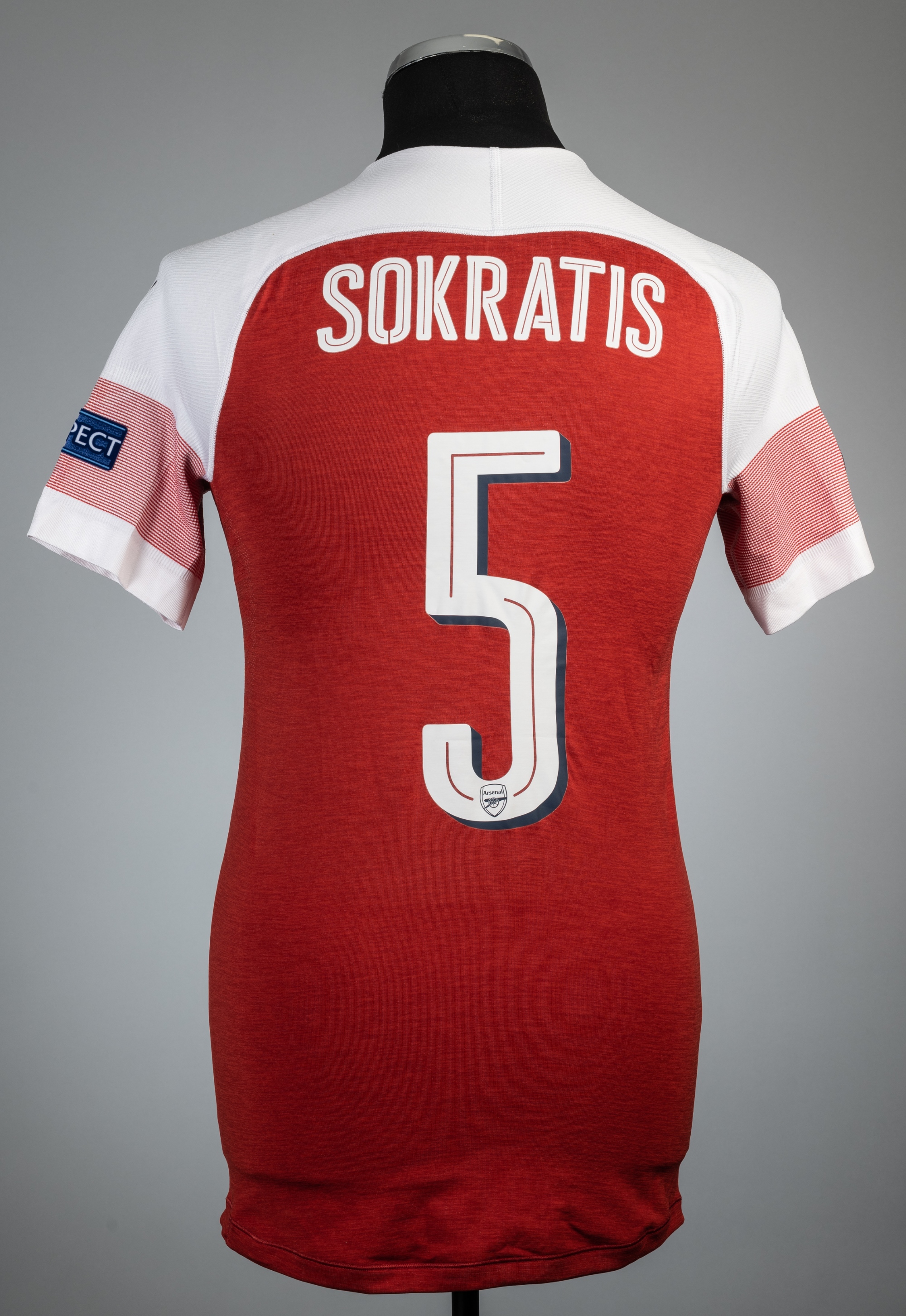 Sokratis red Arsenal UEFA Europa League final No.5 jersey v Chelsea, played at Olympic Stadium Baku, 29th May 2019, Puma, short-sleeved with UEFA EUROPA LEAGUE and RESPECT sleeve badges, club crest and embroidered FINAL BAKU 2019 BAKU OPYMPIC STADIUM - 29 MAY CHELSEAS FC vs ARSENAL FC, sponsor logo, reverse lettered SOKRATIS, size L Chelsea defeated Arsenal 4-1 with Sokratis wearing no.5 short-sleeved jersey in the fixture.