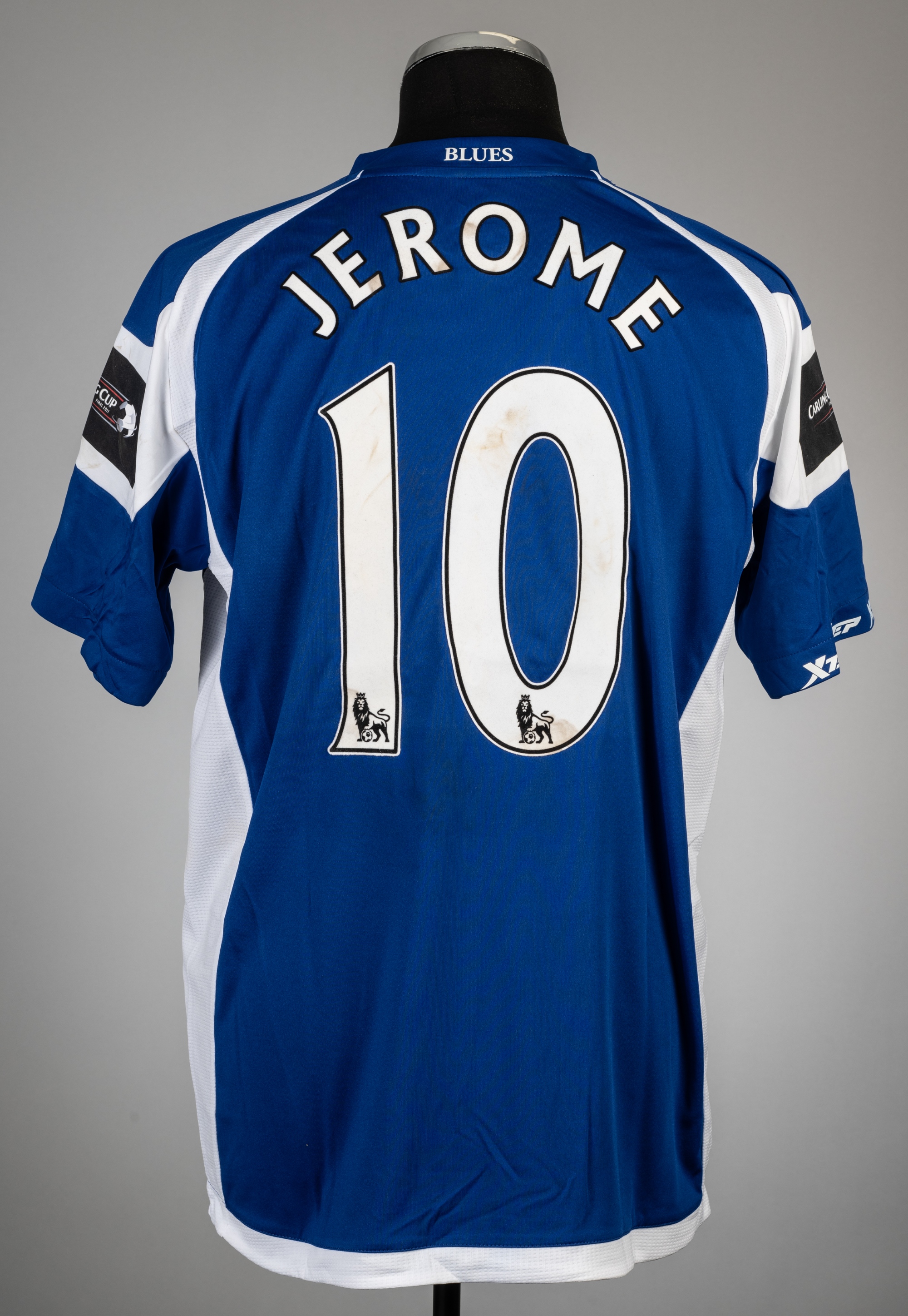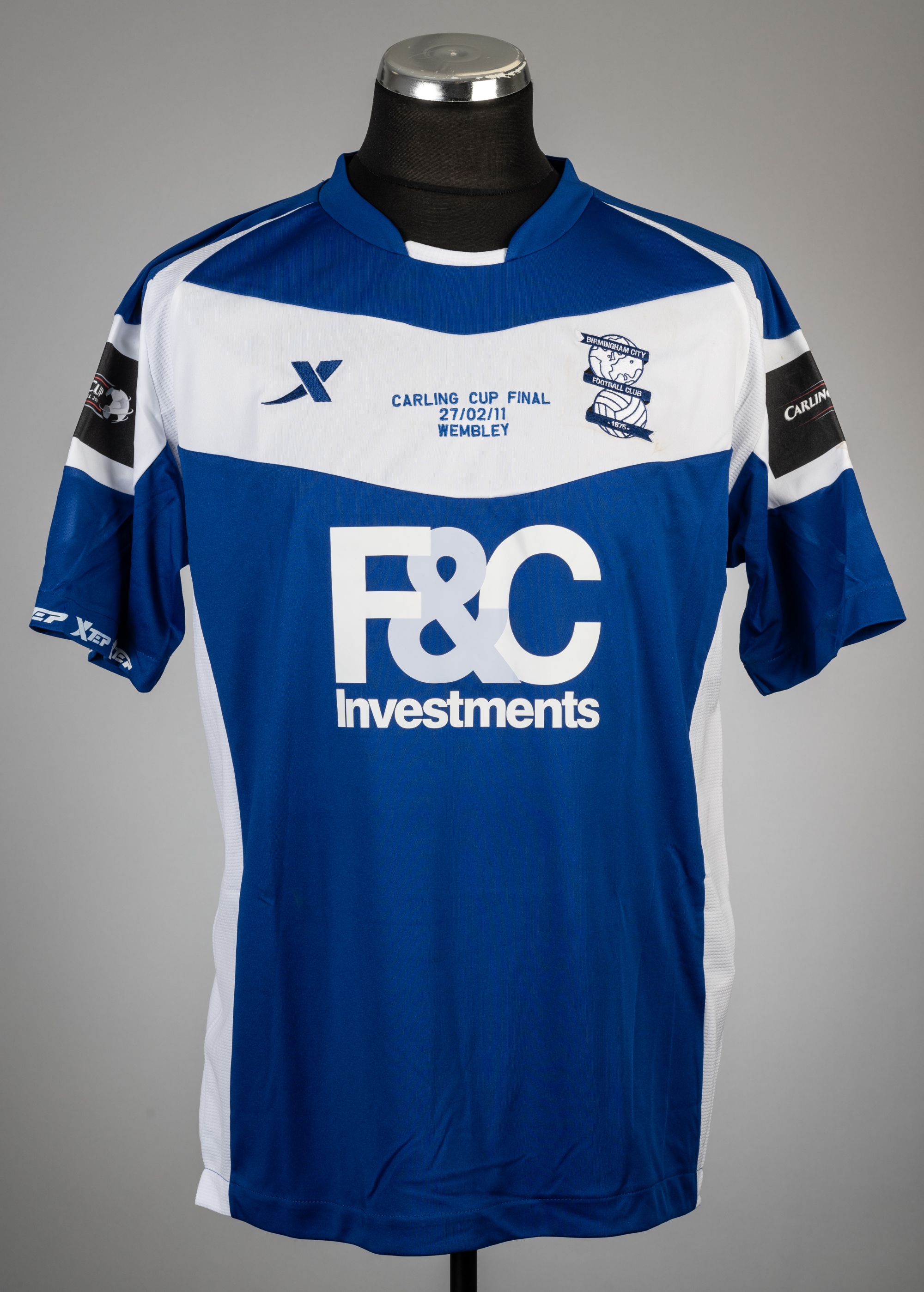Cameron Jerome blue and white Birmingham City Carling Cup final no.10 jersey v Arsenal, played at Wembley, 27th September 2011, Xtep, short-sleeved with CARLING CUP FINAL 2011 sleeve badges, club crest and embroidered CARLING CUP FINAL 27/02/11 WEMBLEY, sponsor logo, reverse lettered JEROME, size L, bears pitch marks on reverse and some on front Birmingham City defeated Arsenal 2-1, with Cameron Jerome substituted on in the 90th minute, wearing a short-sleeved jersey.