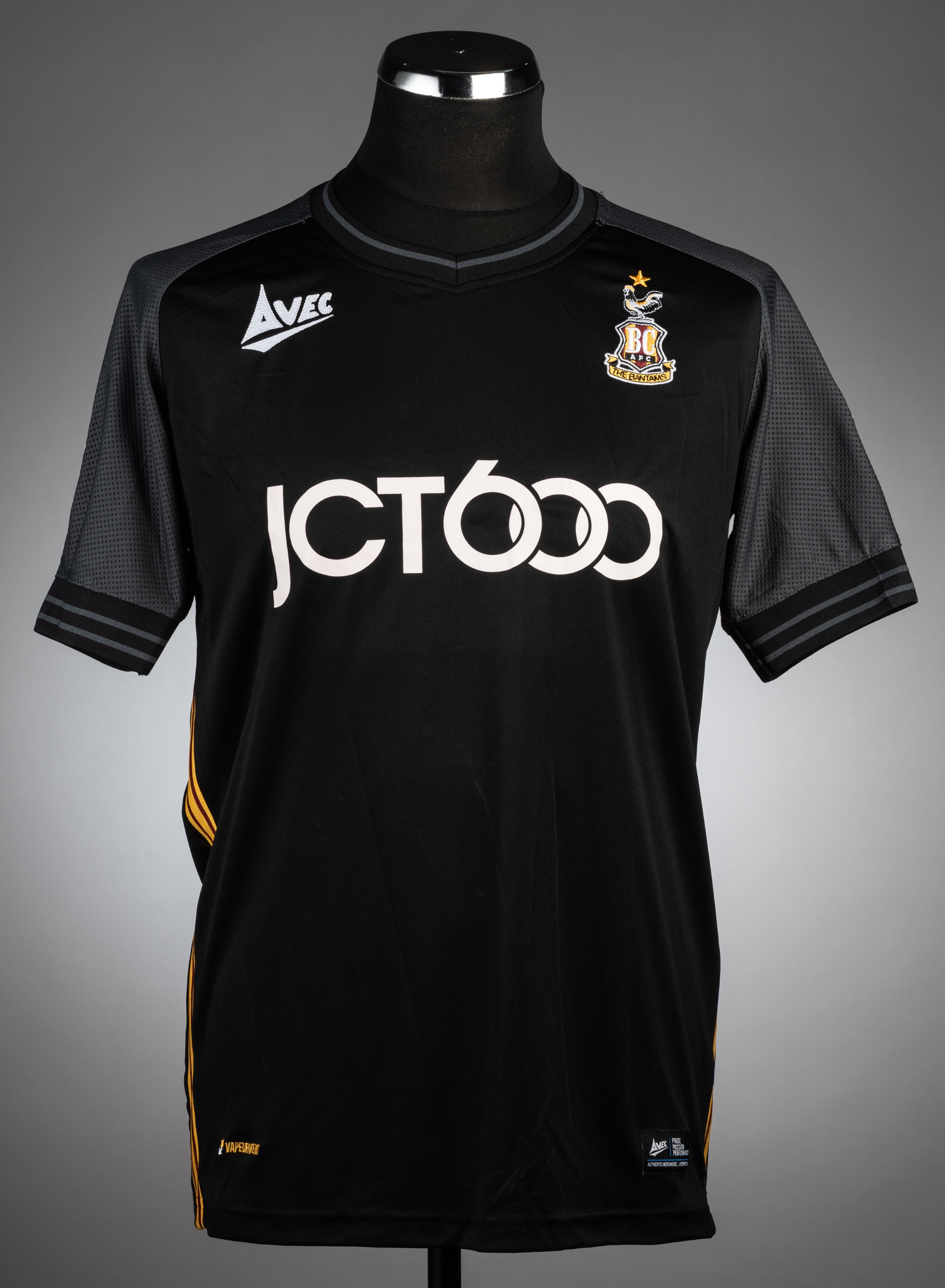 Two Eoin Doyle Bradford City jerseys, circa 2018-19, the first a signed Avec black and grey No.9 third-choice jersey, short-sleeved with SKY BET LEAGUE ONE EFL and SKY BET WHEN THE FUN STOPS STOP sleeve badges, club crest and sponsor logo, reverse lettered DOYLE, signed to number nine in fine black marker pen; the other a Avec claret and black No.9 home, short-sleeved with SKY BET LEAGUE ONE EFL and SKY BET WHEN THE FUN STOPS STOP sleeve badges, club crest and sponsor logo, reverse lettered DOYLE, (2)