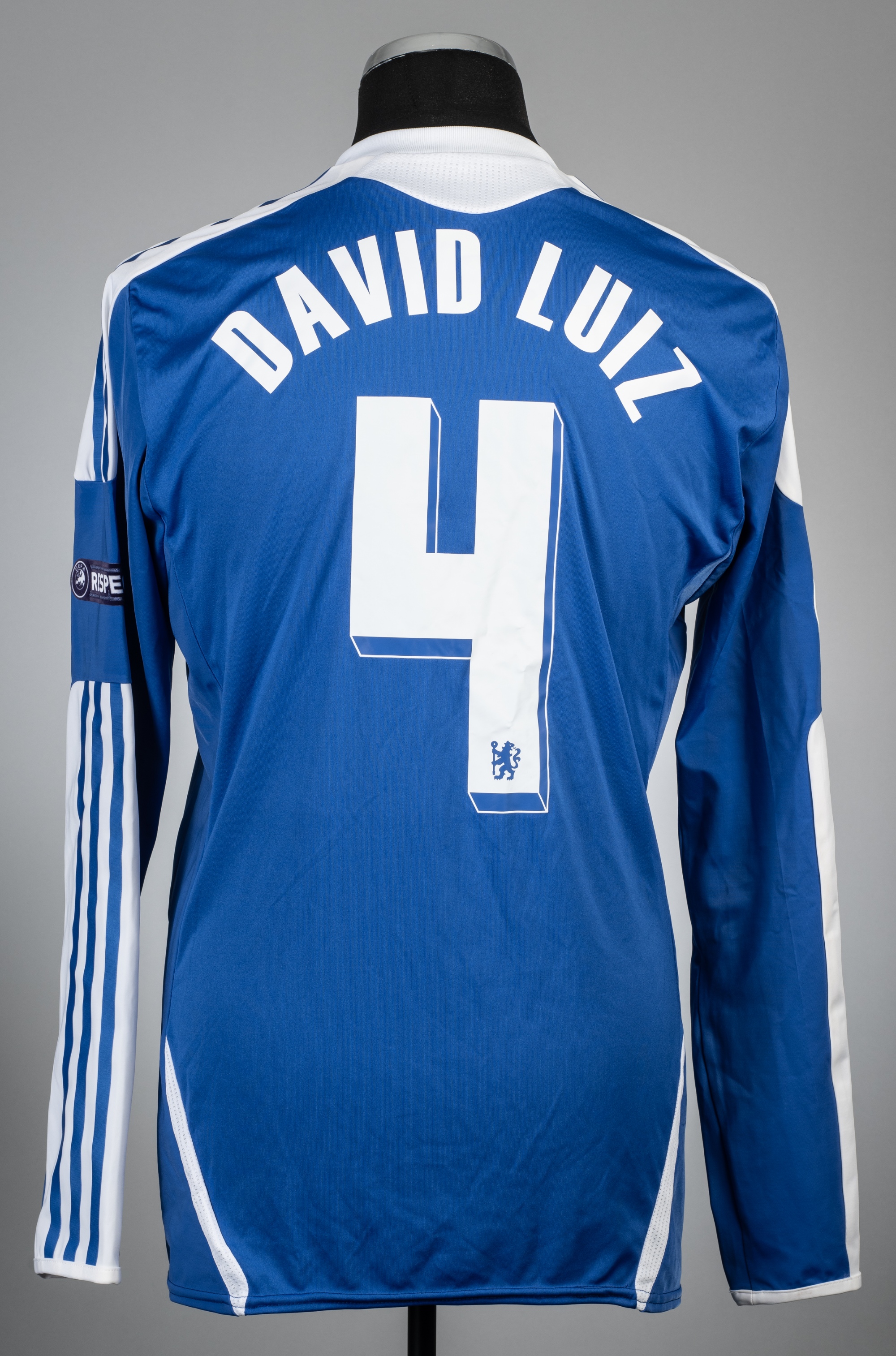David Luiz blue Chelsea no.4 home jersey, season 2011-12, Adidas, player issued long-sleeved with UEFA STARBALL and RESPECT sleeve badges, club crest and sponsor logo, reverse lettered DAVID LUIZ, size 10 UK