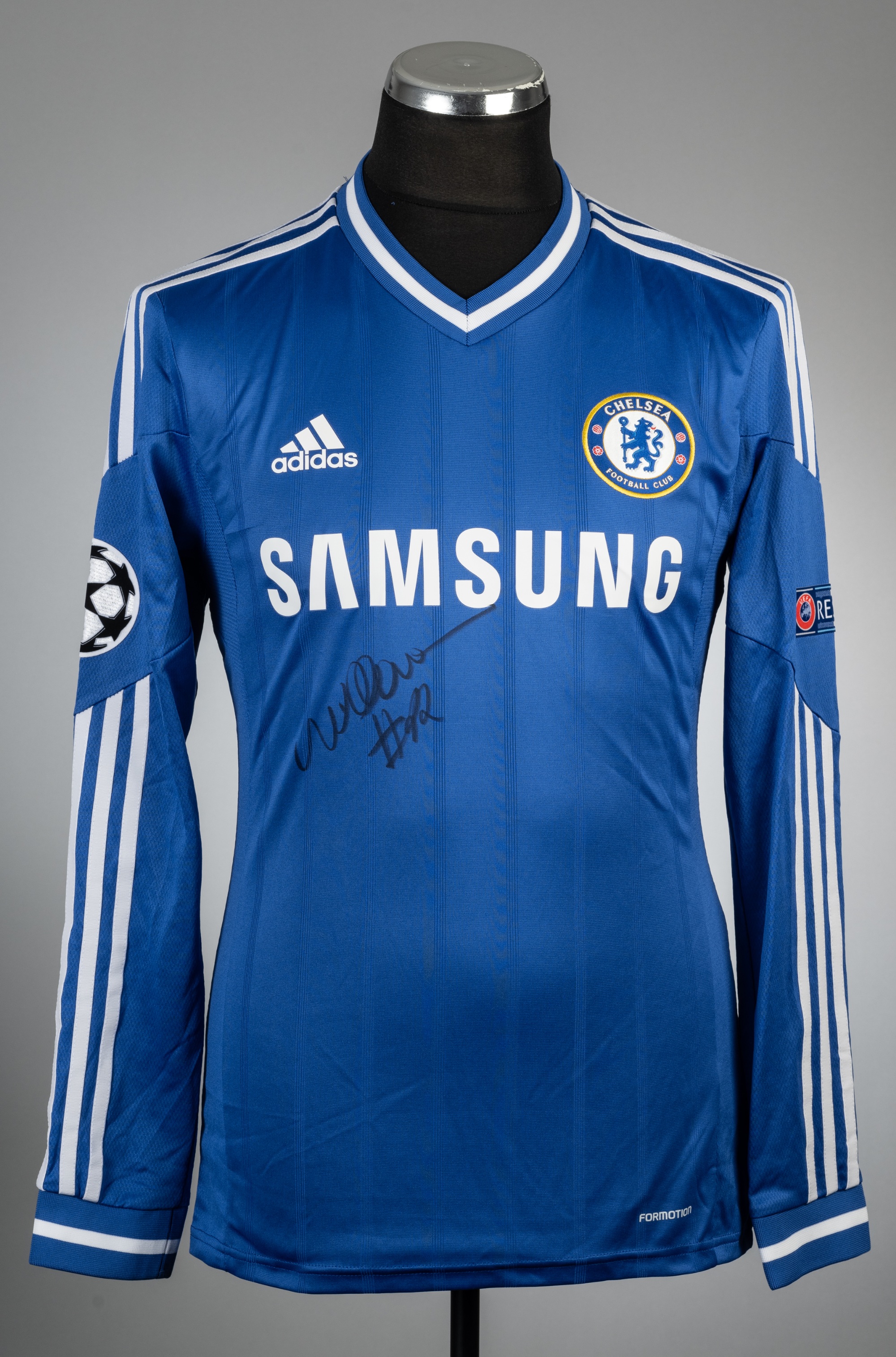Willian signed blue Chelsea no.22 home jersey, season 2013-14, Adidas, player issued long-sleeved with UEFA STARBALL and RESPECT sleeve badges, club