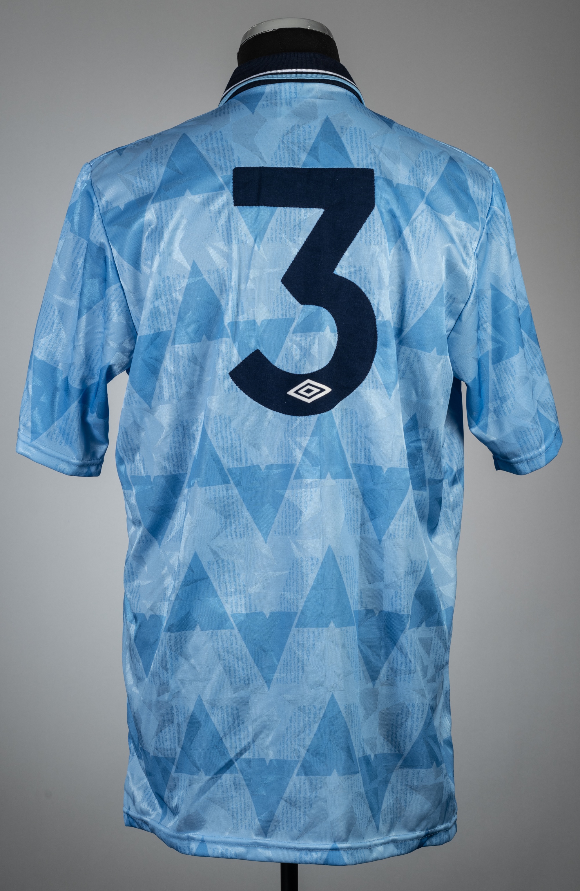 Blue Manchester City no.3 home jersey, season 1989-90, Umbro, short-sleeved with embroidered club crest and Umbro logo, sponsor's logo, reverse numbe