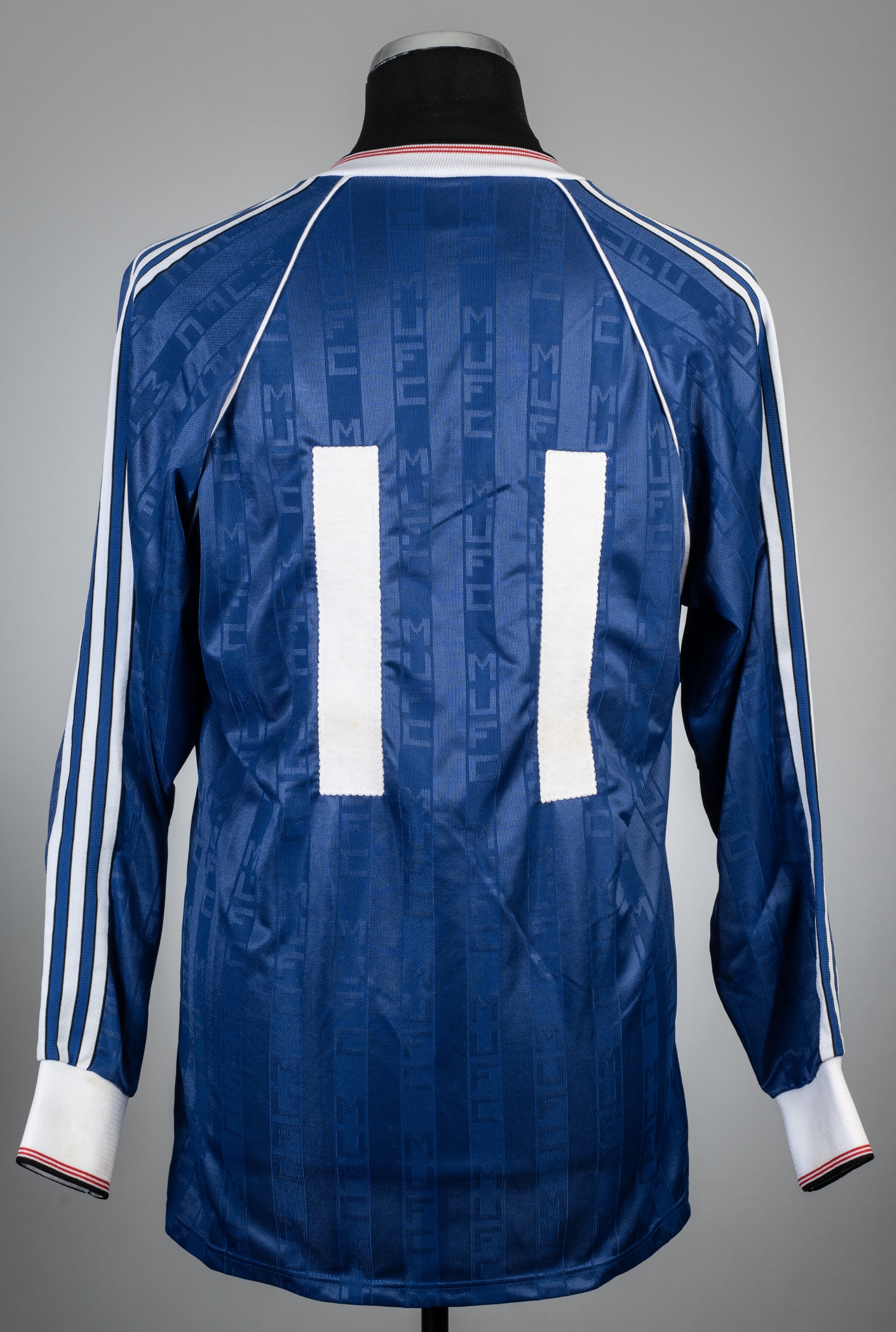 Blue Manchester United no.11 third choice jersey, division one season 1989-90, Adidas, long-sleeved, with embroidered club crest and sponsor logo, reverse numbered 11, size L 40/44in., bears handwritten no.11 on neck label in ink