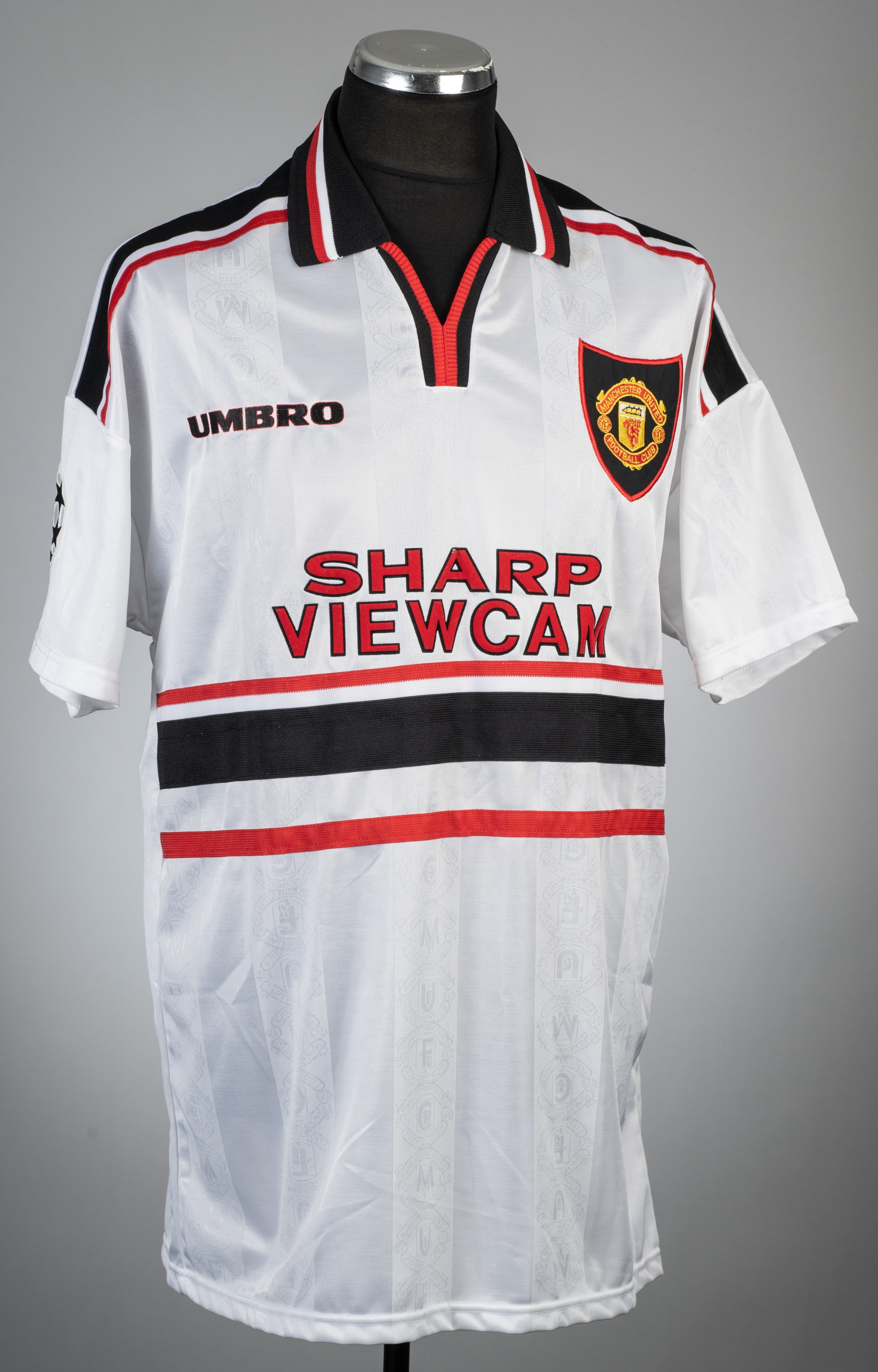 Paul Scholes white Manchester United no.18 away jersey, season 1997-98, Umbro, short-sleeved with UEFA STARBALL sleeve badge, club crest and sponsor