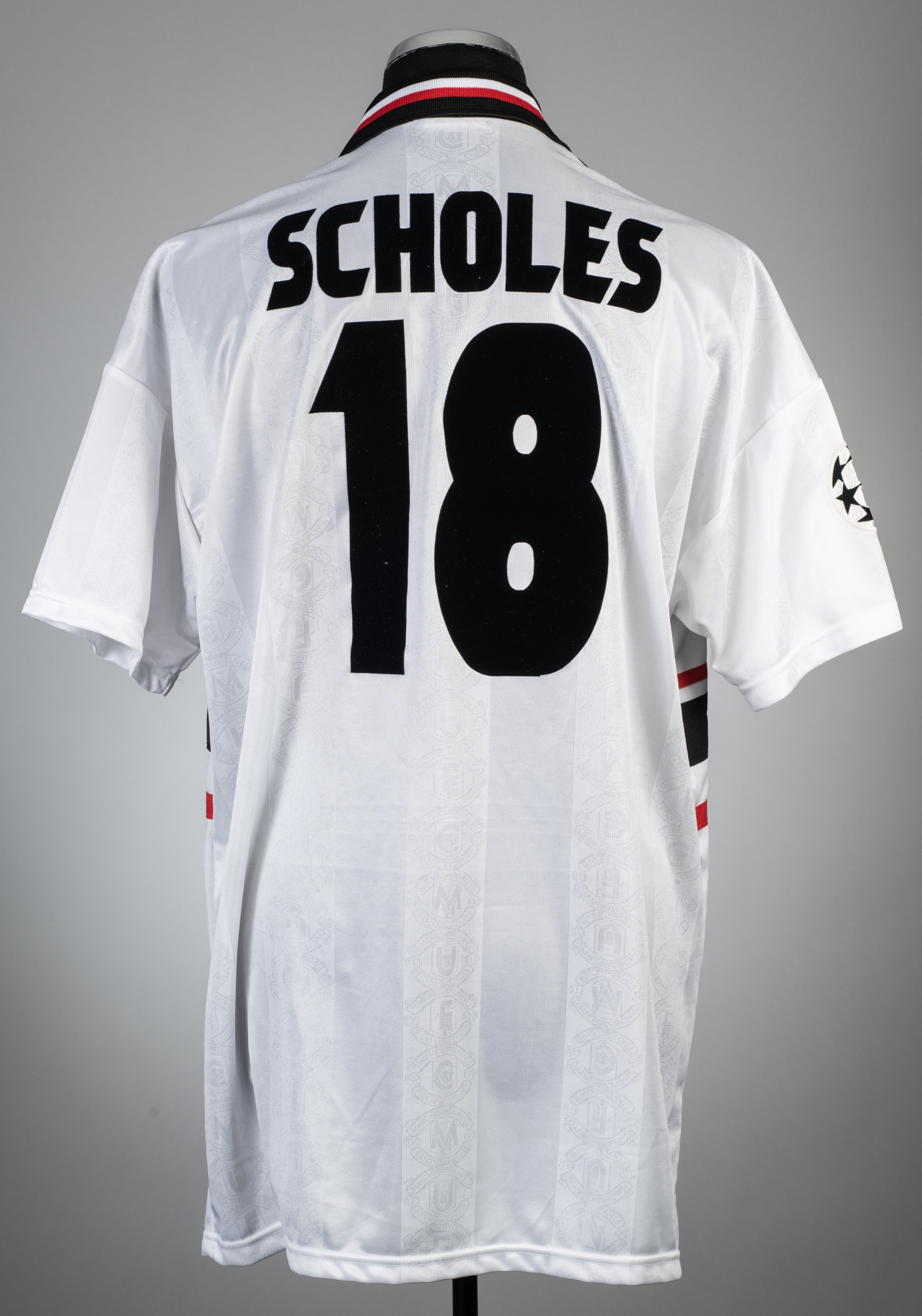 Paul Scholes white Manchester United no.18 away jersey, season 1997-98, Umbro, short-sleeved with UEFA STARBALL sleeve badge, club crest and sponsor logo, reverse lettered SCHOLES, size XL