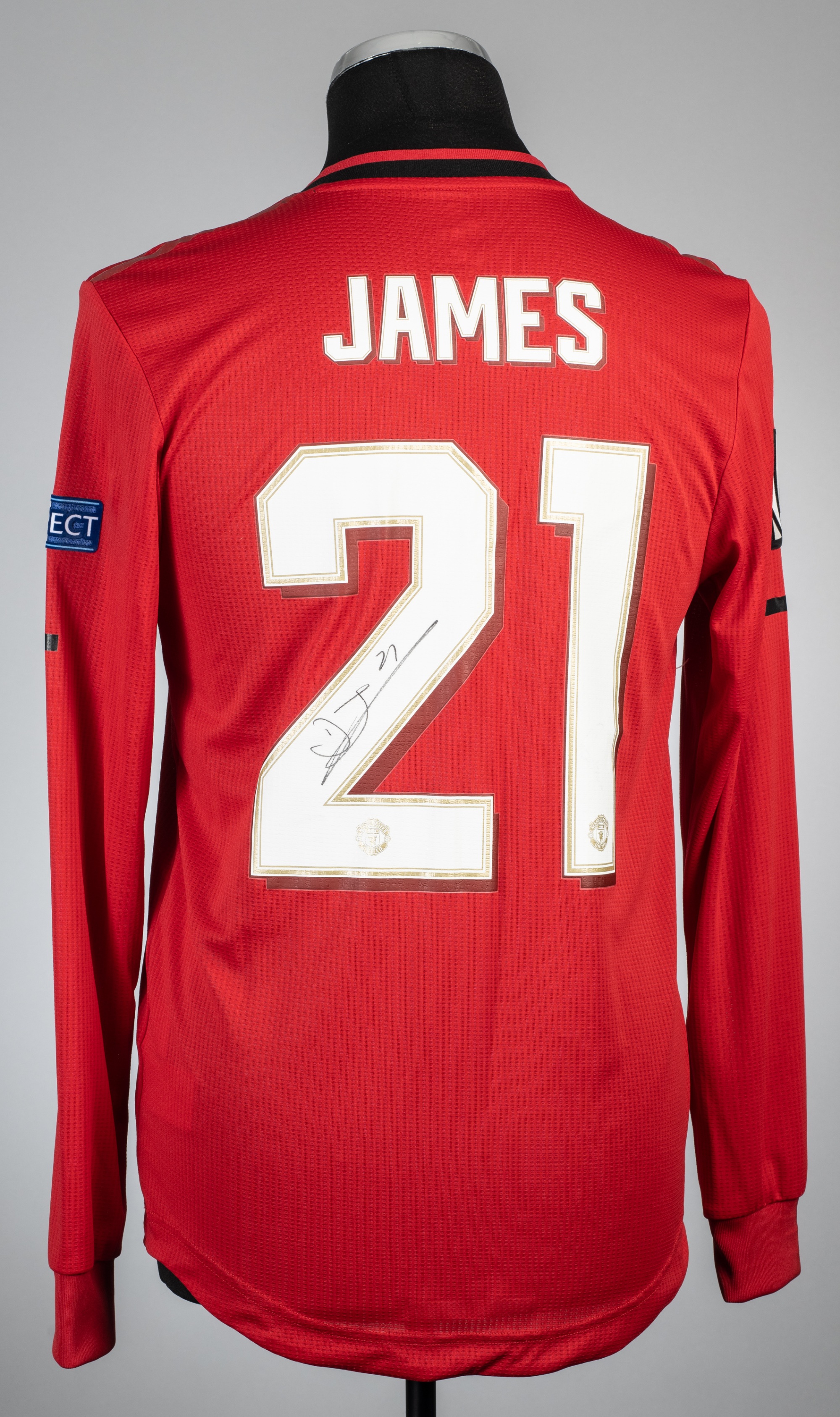 Daniel James signed red Manchester United no.21 home jersey, season 2018-20, adidas, long-sleeved with UEFA EUROPA CUP and RESPECT sleeve badges, club crest and sponsor logo, reverse lettered JAMES, signed in black marker pen on number two, bears applied printed sticker label with DANIEL JAMES EUROPA LEAGUE V FK PARTIZAN (A) 24TH OCTOBER 2019, size 5