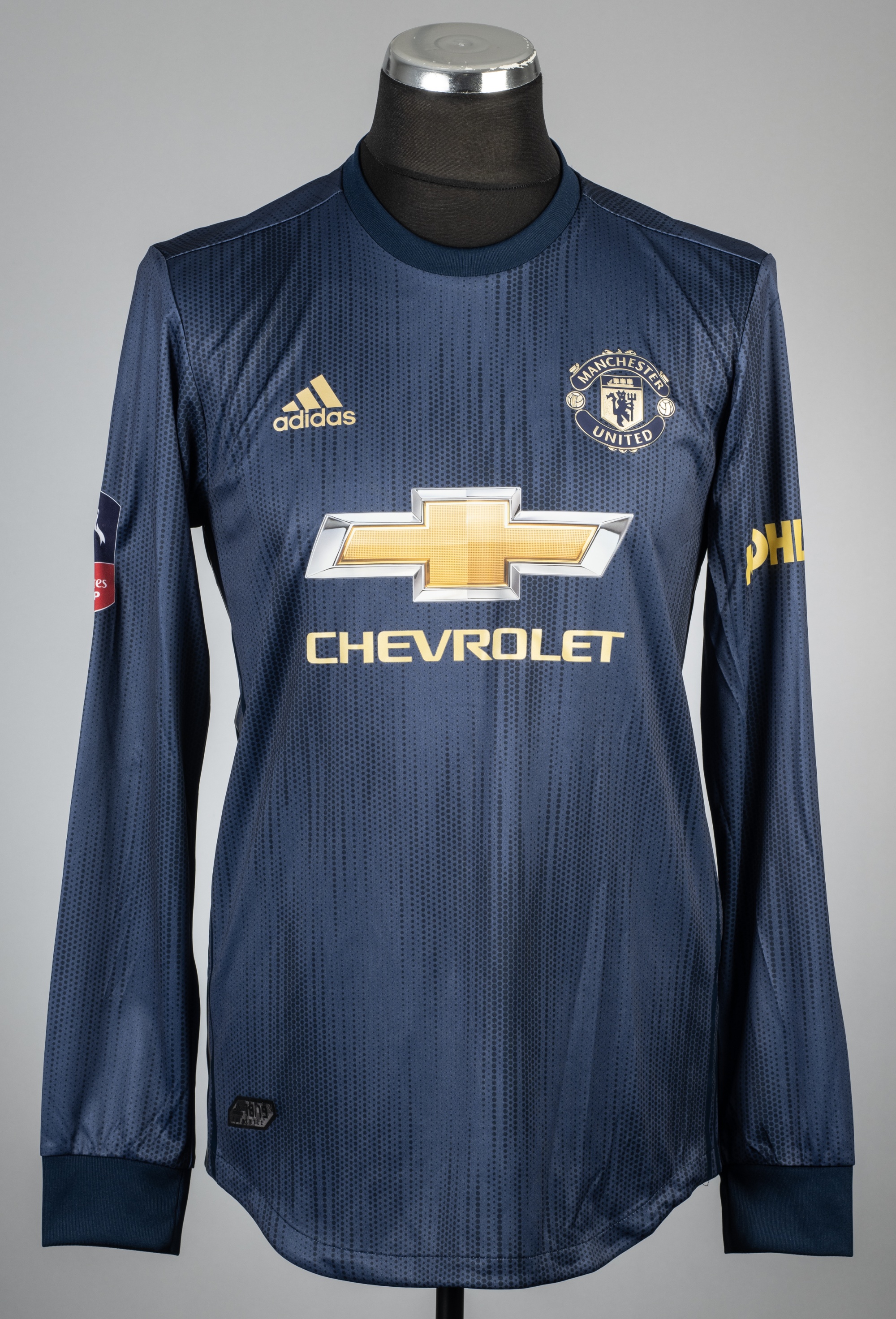 Alexis Sanchez navy Manchester United no.7 third choice jersey, season 2018-19, Adidas, long-sleeved with THE EMIRATES FA CUP sleeve badge, club cres