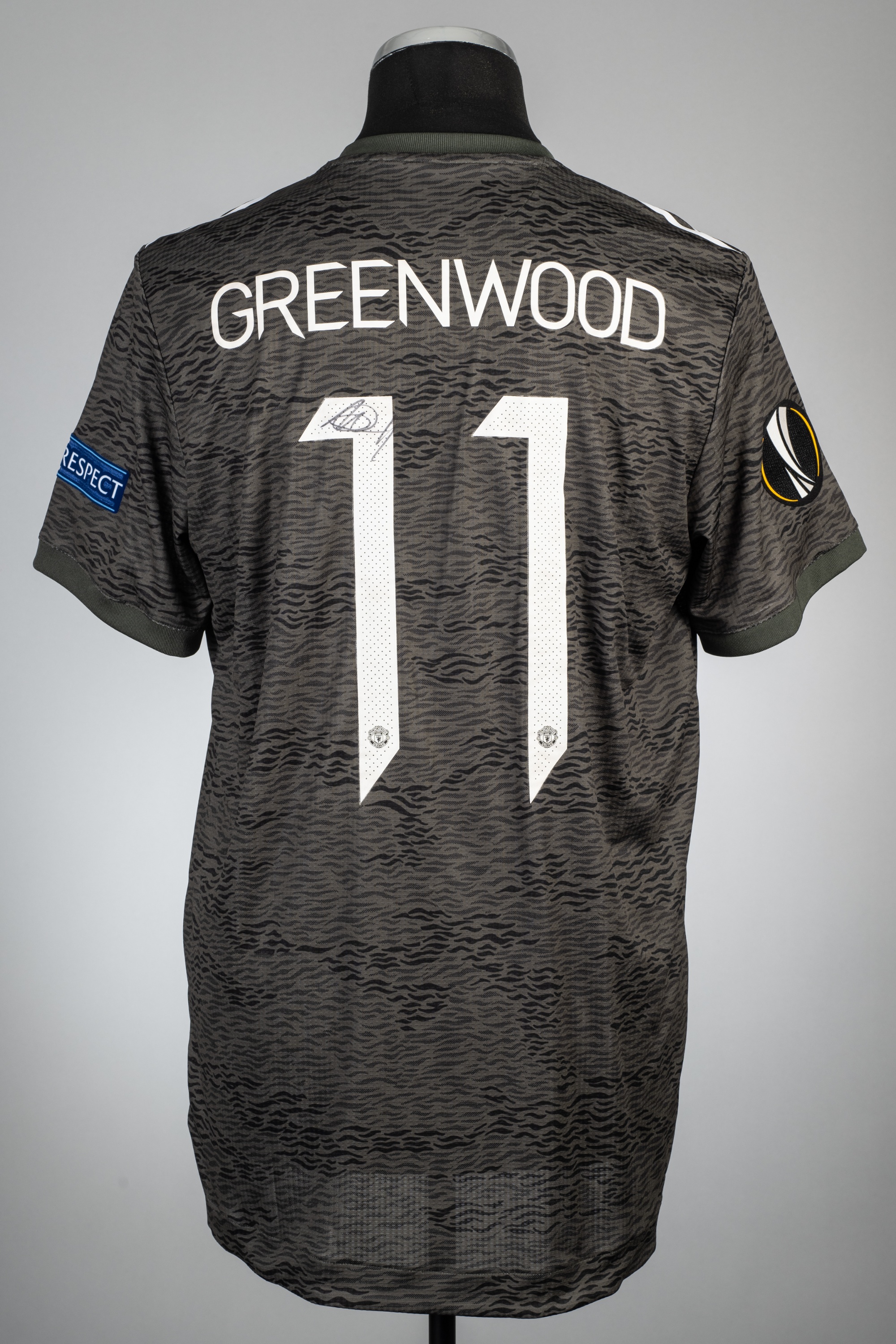 Mason Greenwood signed grey Manchester United no.11 away jersey, season 2020-21, Adidas, short-sleeved with UEFA EUROPA CUP and RESPECT sleeve badges, club crest and sponsor logo, reverse lettered GREENWOOD, signed in black marker pen on front and reverse, size 8