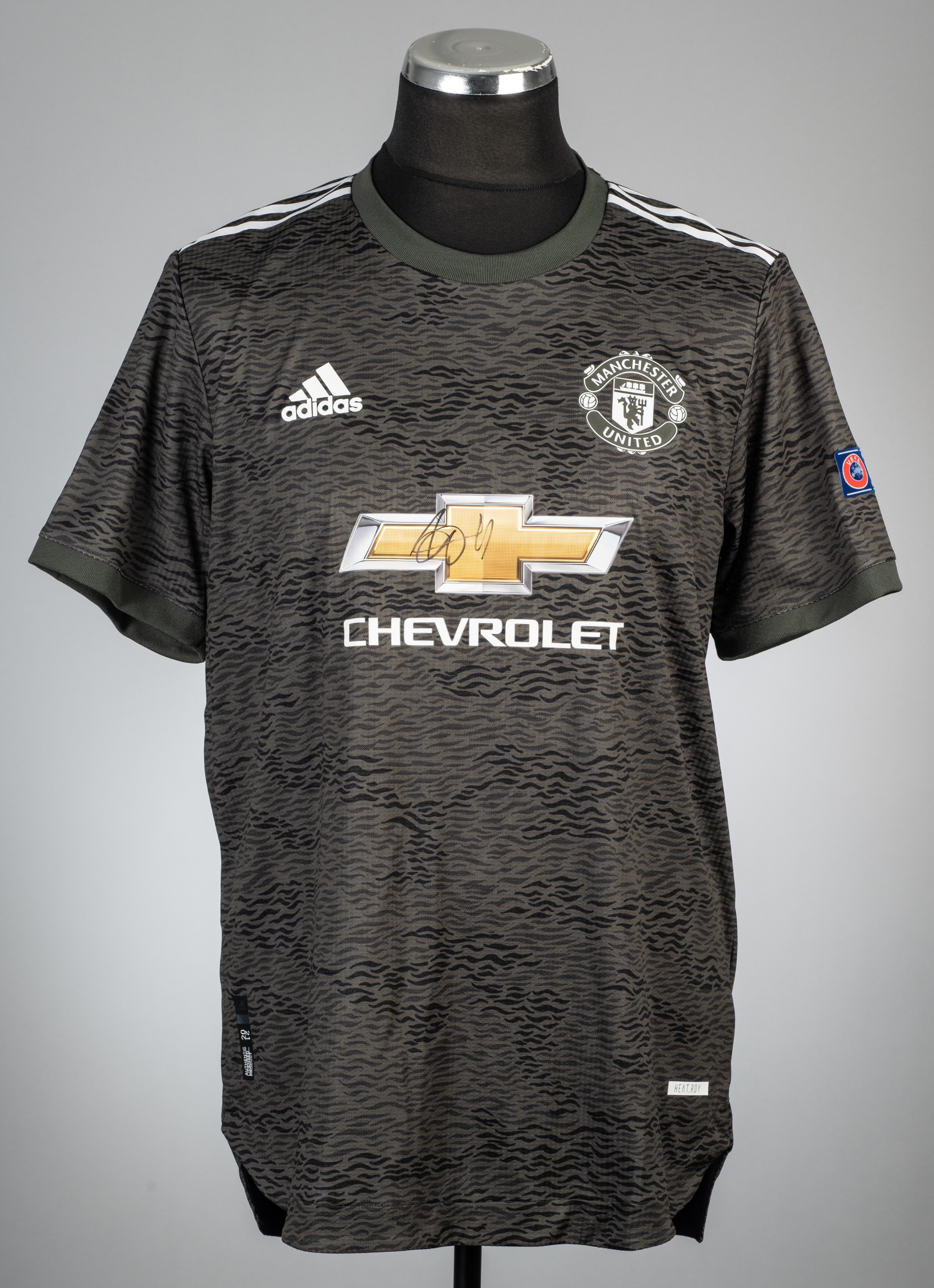 Mason Greenwood signed grey Manchester United no.11 away jersey, season 2020-21, Adidas, short-sleeved with UEFA EUROPA CUP and RESPECT sleeve badges
