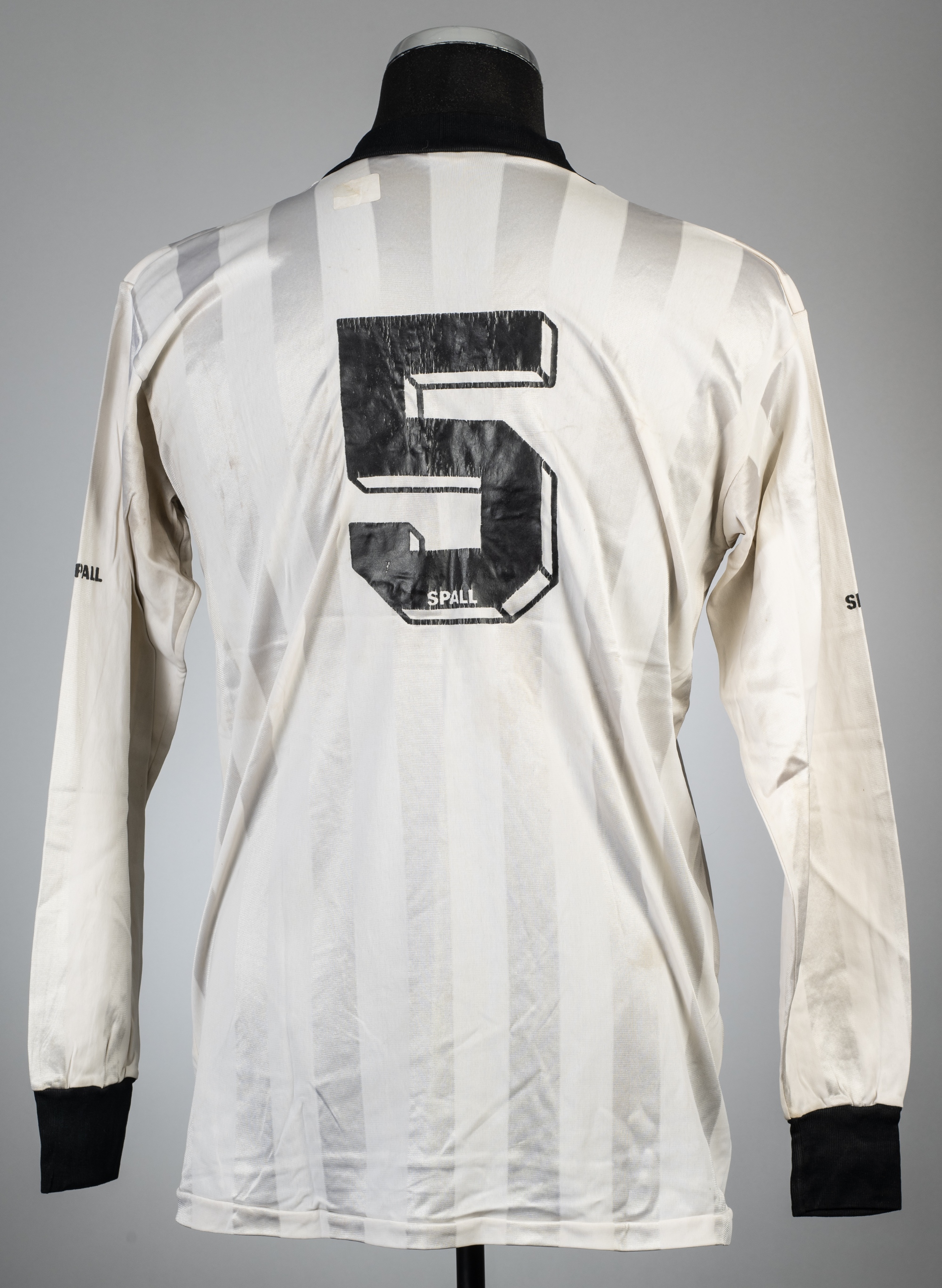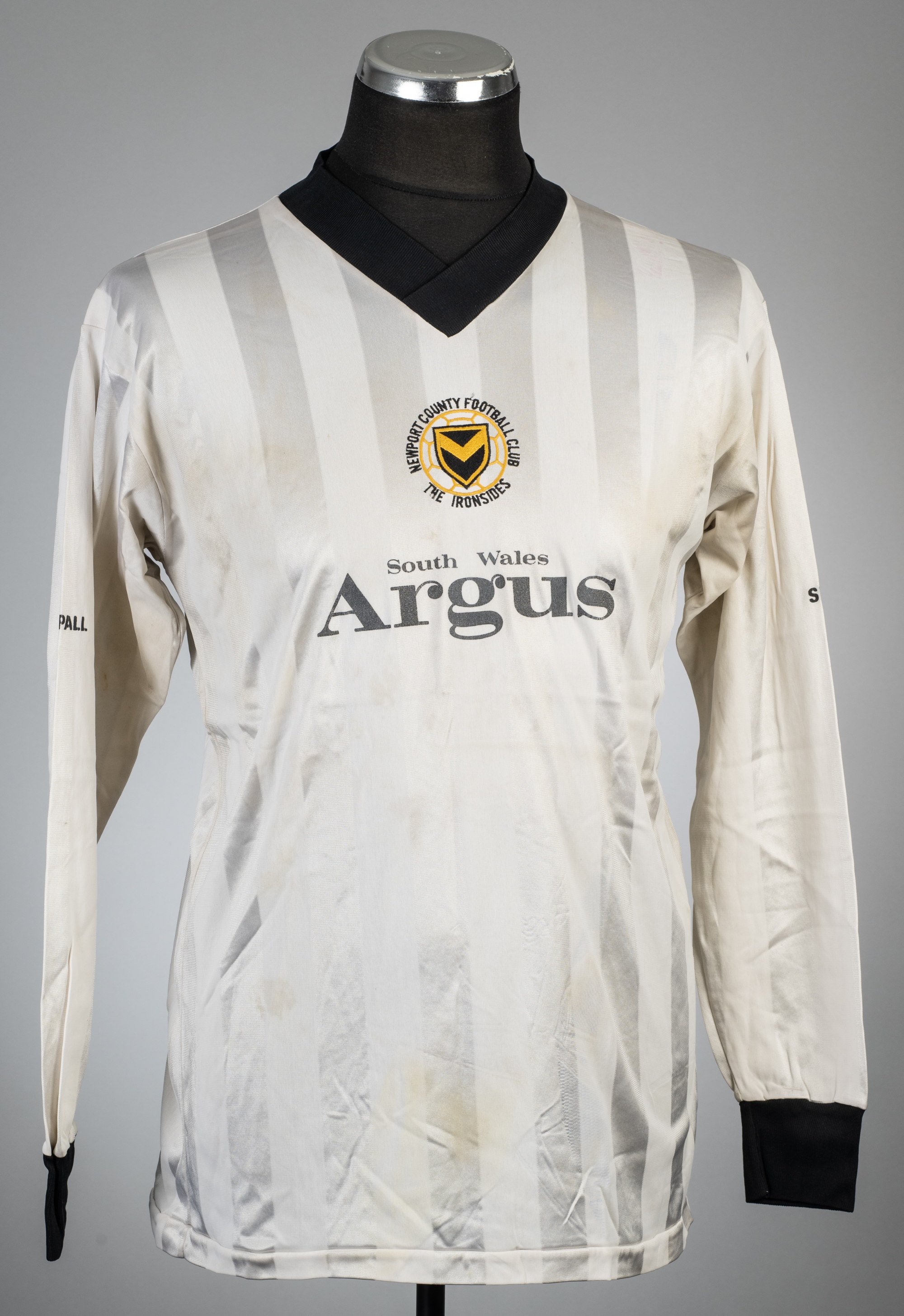 Rare white Newport County no.5 away jersey which was used by the club in their very last football conference match at Maidstone on 11th February 1989, Spall, long-sleeved with embroidered club crest and NEWPORT COUNTY FOOTBALL CLUB THE IRONSIDES, South Wales Argus sponsor logo to front, reverse numbered 5, size LM, when there was a colour clash with their opponents, listed in the programme as colours white jersey, white shorts and socks, bears slight wear The no.5 jersey was worn by Chris Banks in the match. Provenance: the jersey was obtained when Newport sold off any items of value at liquidation.
