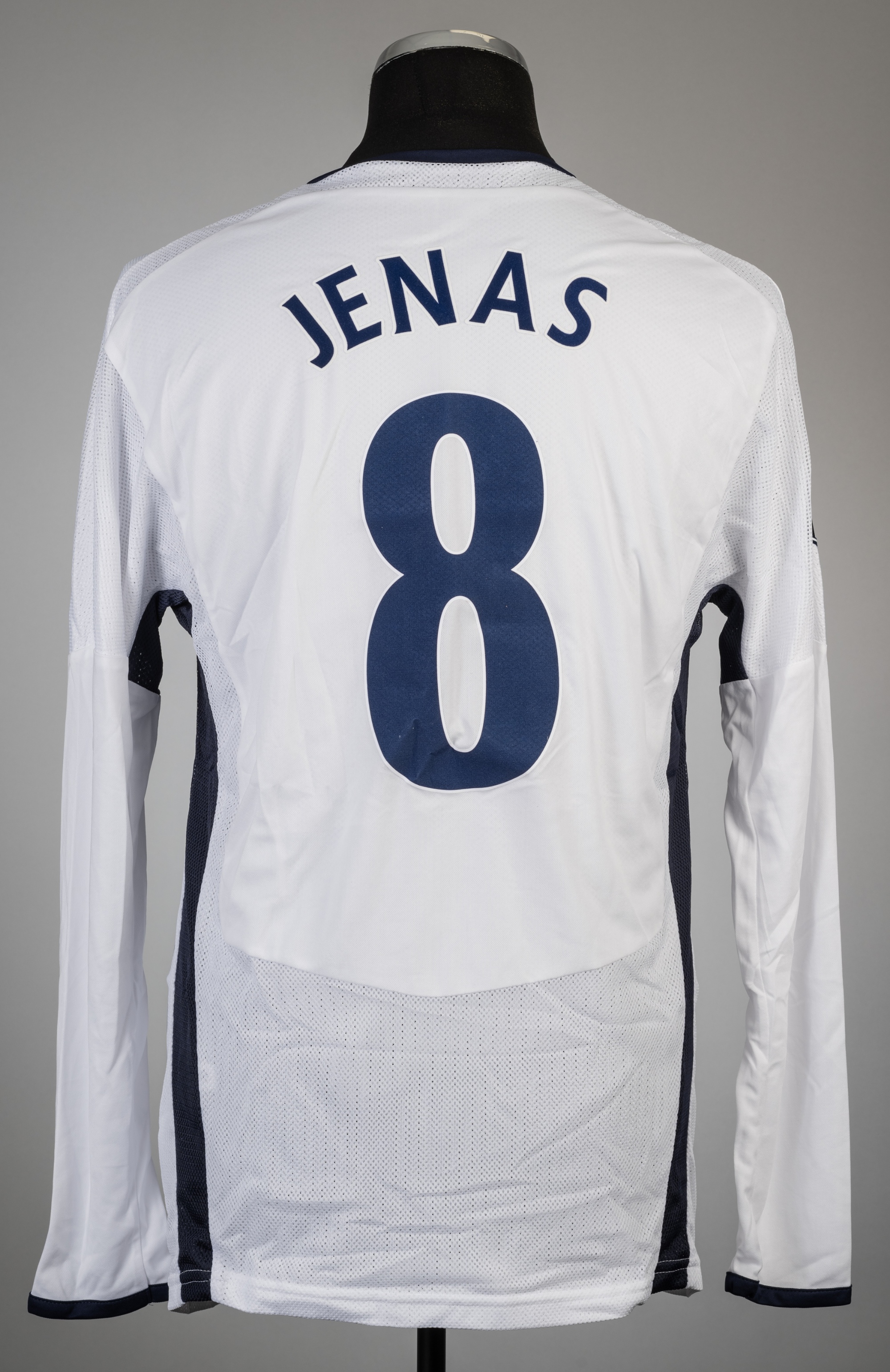 Jermaine Jenas white Tottenham Hotspur no.8 home jersey, season 2008-09, Puma, long-sleeved with UEFA CUP sleeve badge, club crest and sponsor logo, reverse lettered JENAS, size L