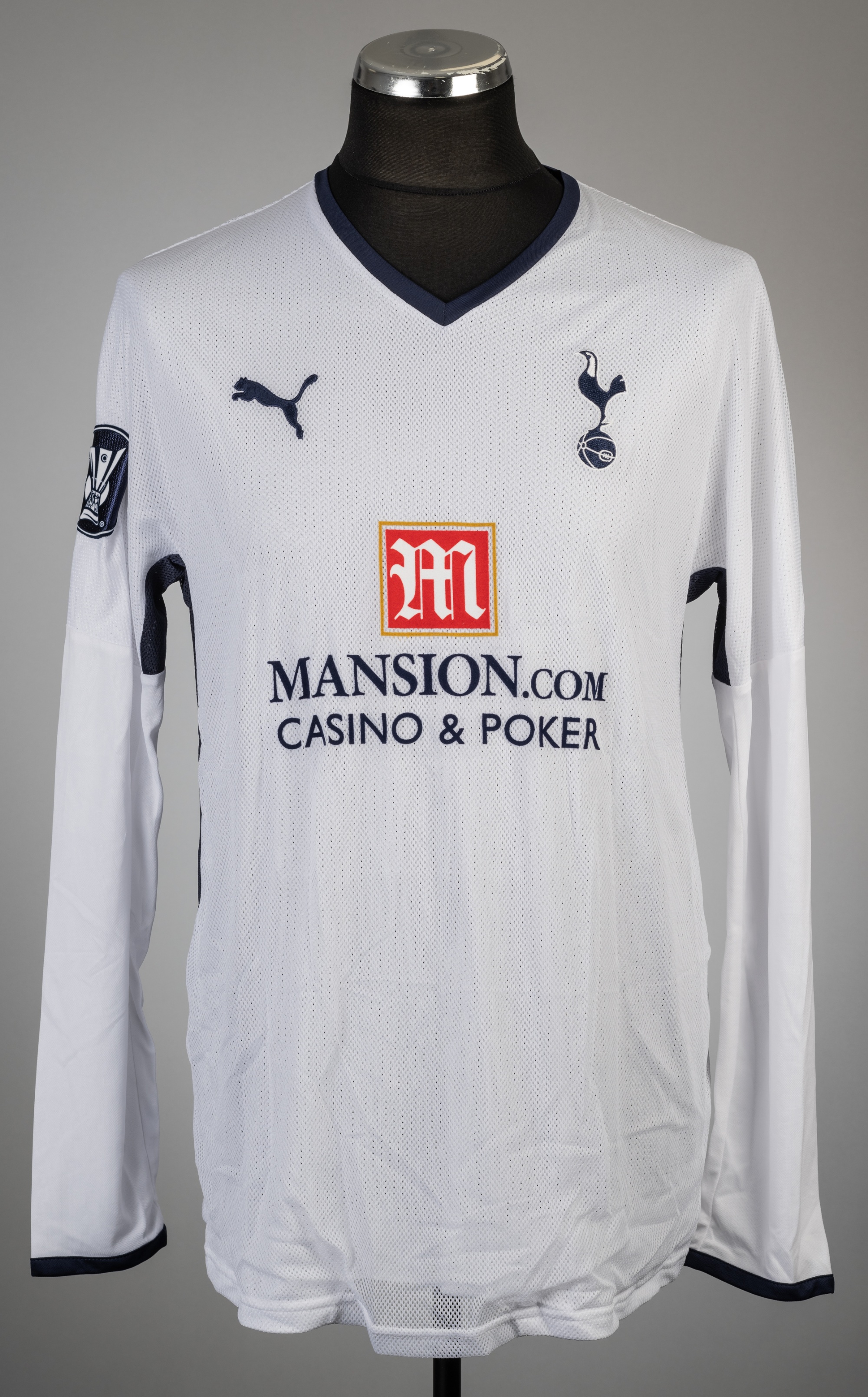 Jermaine Jenas white Tottenham Hotspur no.8 home jersey, season 2008-09, Puma, long-sleeved with UEFA CUP sleeve badge, club crest and sponsor logo,
