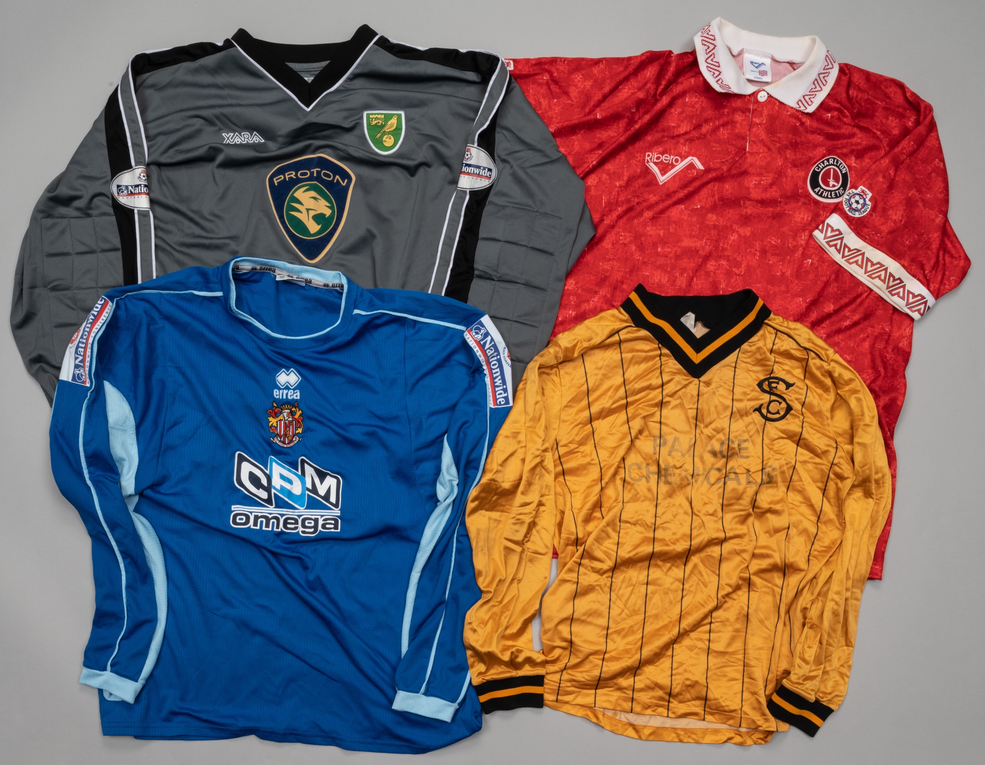 Three football jerseys for Charlton Athletic, Norwich City and Stevenage, comprising Colin Walsh red Charlton Athletic no.21 home jersey, season 1993-94, Ribero, short-sleeved with THE FOOTBALL LEAGUE sleeve badges, club crest and sponsor logo, reverse lettered WALSH, stains and yellowing to white sleeve cuffs and collar; Paul Crichton grey Norwich City no.12 goalkeeper's jersey, season 2003-04, Xara, long-sleeved with padded elbows, NATIONWIDE FOOTBALL LEAGUE sleeve badges, club crest and sponsor logo, reverse lettered CRICHTON, size XXXL; Mark Beard blue Stevenage no.26 jersey, season 2006-07, Errea, long-sleeved with NATIONWIDE CONFERENCE sleeve badges, club crest and sponsor logo, reverse lettered BEARD, size XXL and a further orange no.7 football jersey, Umbro, long-sleeved with SFC embroidered club crest and remnants of sponsor name PALACE CHEMICALS on front, (4)
