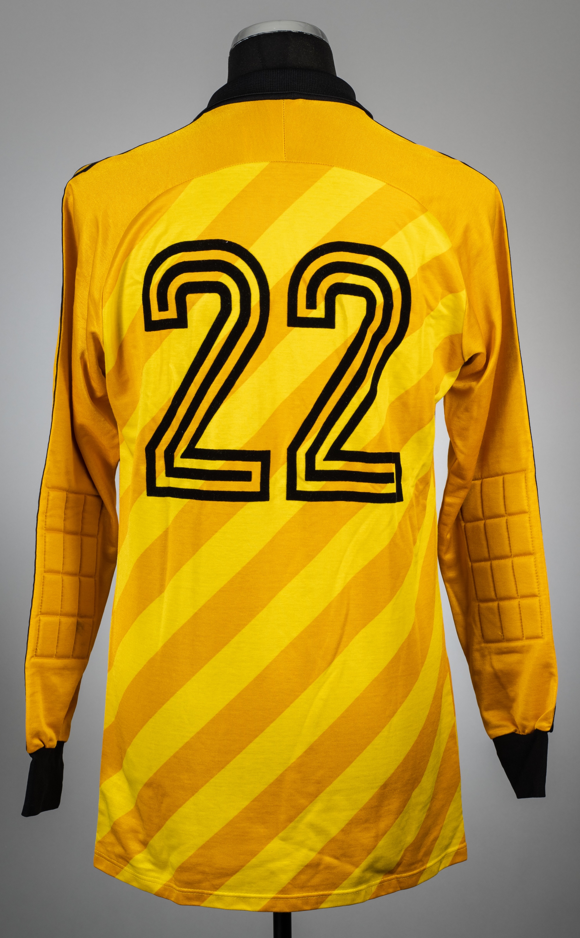 Ludek Miklosko yellow and orange Czechoslovakia no.22 goalkeeper's jersey, circa 1980s, Adidas, long-sleeved with padded elbows, embroidered country emblem badge, reverse numbered 22, size Large UK