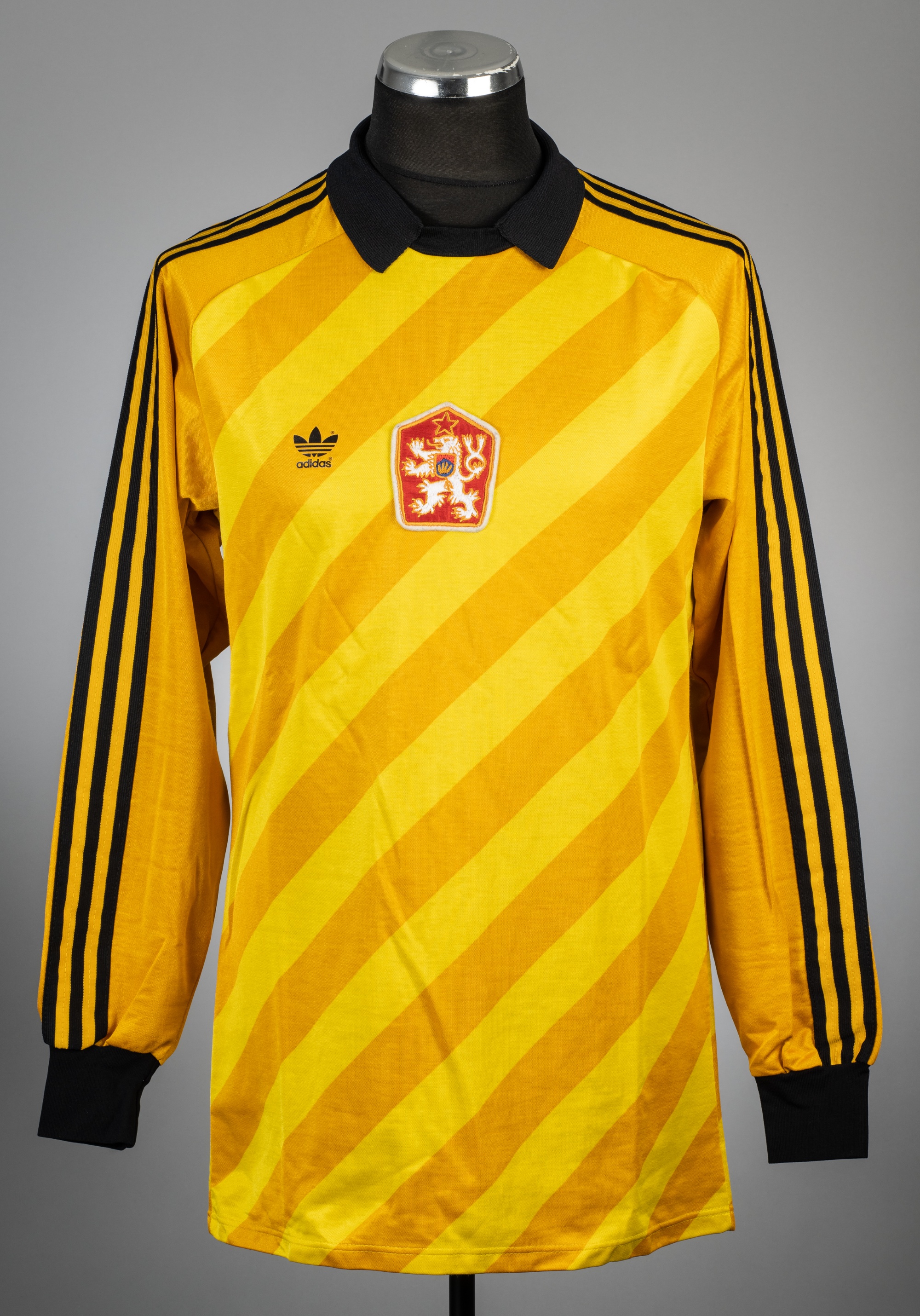 Ludek Miklosko yellow and orange Czechoslovakia no.22 goalkeeper's jersey, circa 1980s, Adidas, long-sleeved with padded elbows, embroidered country