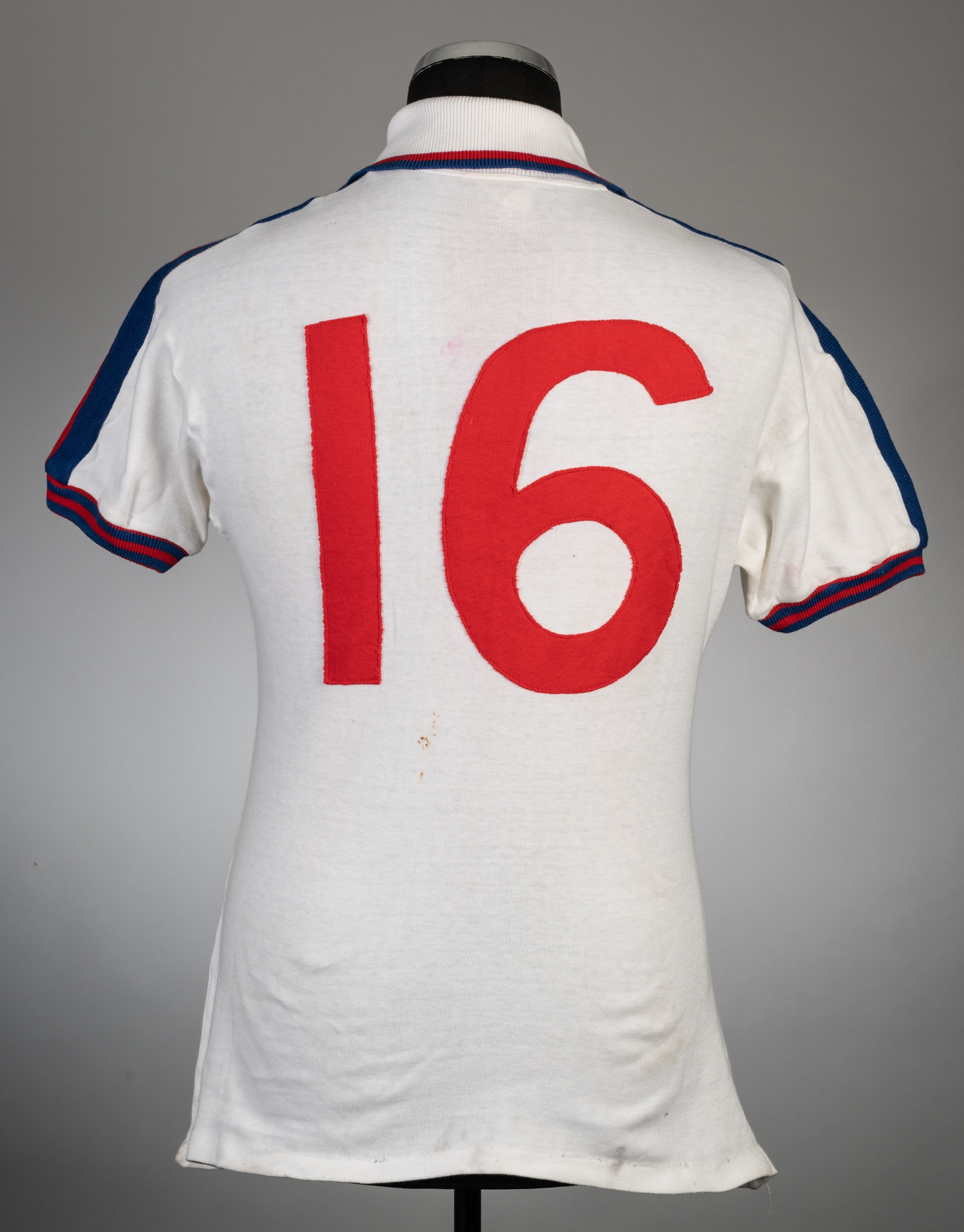 Ray Wilkins white England No.16 international jersey worn in the 1978 British Home International Championships, Admiral, short-sleeved, blue & red trim, with embroidered three lion badge and yellow Admiral badge, reverse numbered 16, size 38in., bears staining on reverse