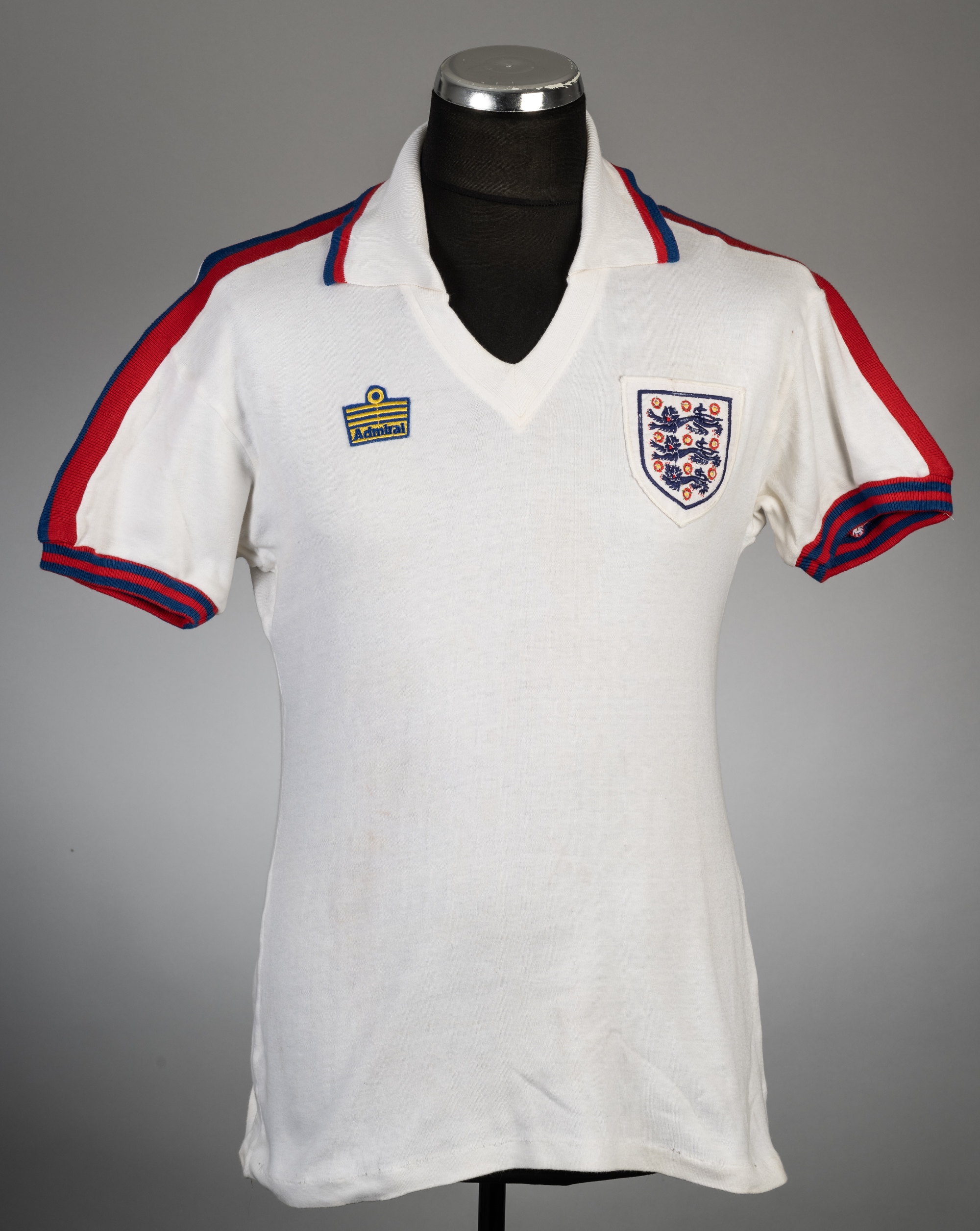 Ray Wilkins white England No.16 international jersey worn in the 1978 British Home International Championships, Admiral, short-sleeved, blue & red tr