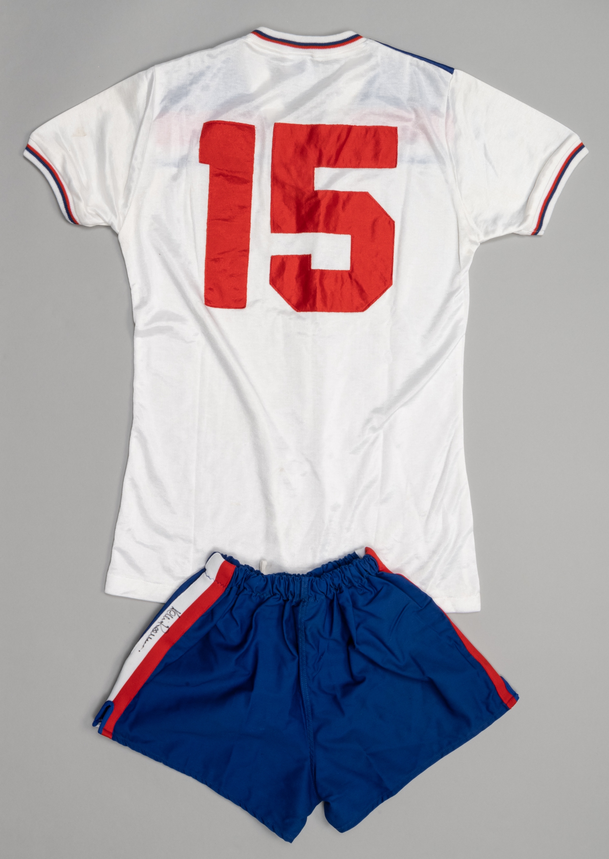 Kevin Reeves signed England home kit, season 1980-83, comprising white England no.15 jersey, Admiral, short-sleeved with national emblem badge and red Admiral badge, reverse numbered 15, size 38/40in., signed in black marker to front; sold together with blue Admiral shorts with red and white seams, yellow Admiral badge, signed in black marker pen to one white seam and a pair of signed white socks with red and blue bands, signed in black marker pen, (3)