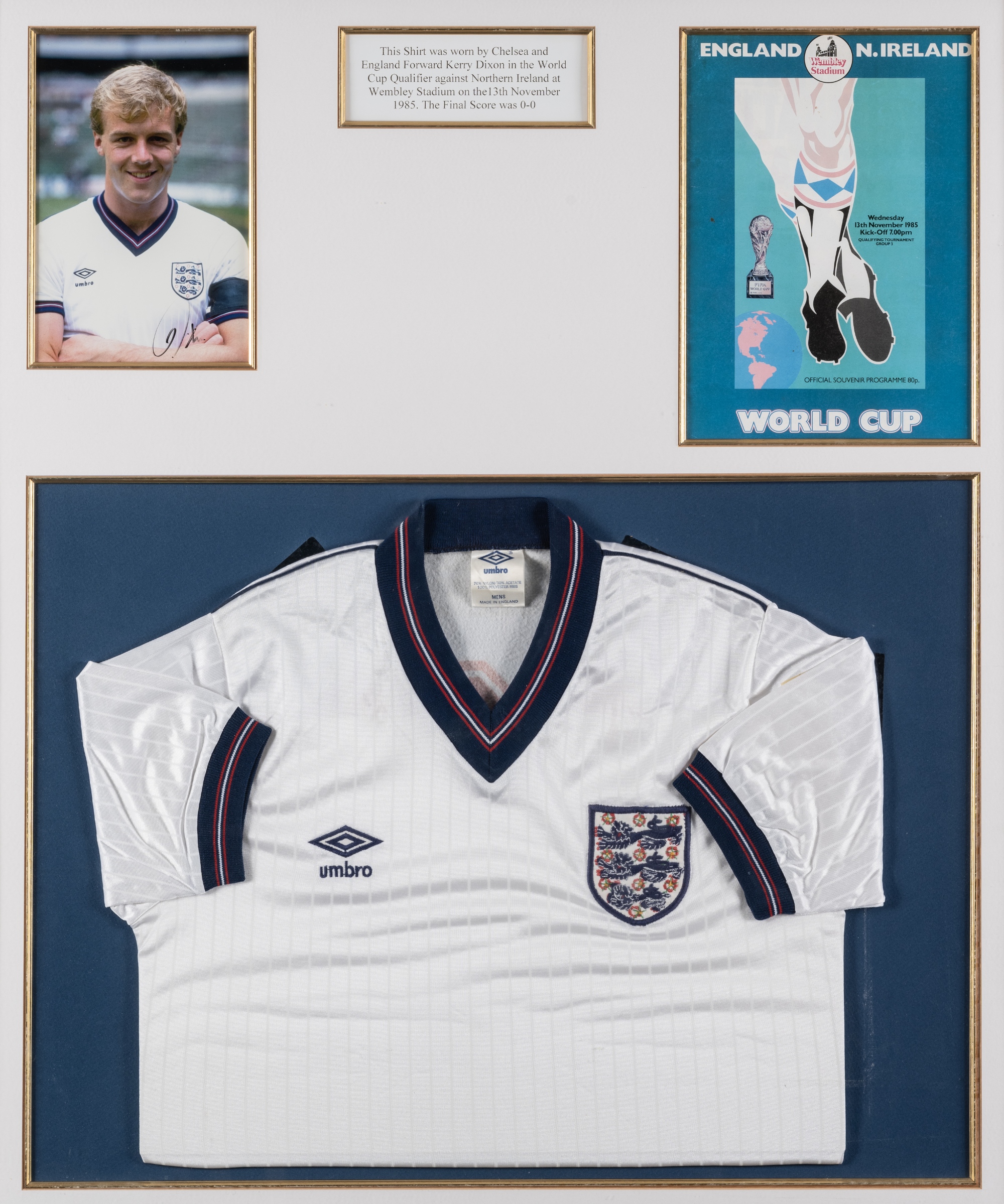 Kerry Dixon England jersey worn in the World cup qualifier v Northern Ireland at Wembley Stadium, 13th November 1985, the white Umbro short-sleeved jersey with embroidered national three lion badge and Umbro logo mounted below a signed colour photograph of Kerry Dixon, signed in black marker pen and match programme, with legend, glazed and framed, overall 93 by 78cm. All glass will be removed from framed and glazed items prior to posting and may result in delays to shipping your items. (This service is included in the cost of postage and packing). We can also totally remove all framing and mounts upon request to reduce shipping costs. Alternatively lots can be collected in person by prior appointment from NN8 1RT.