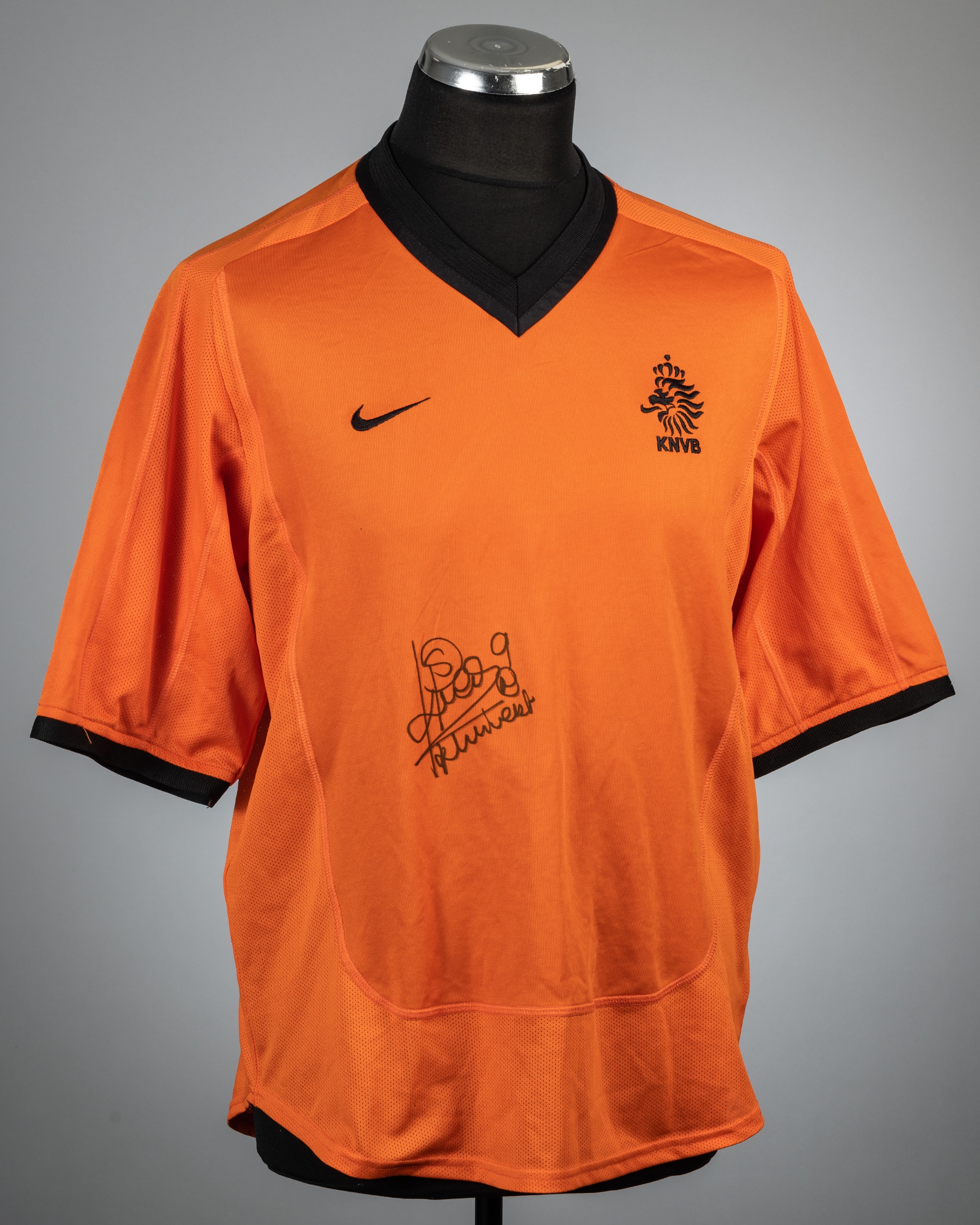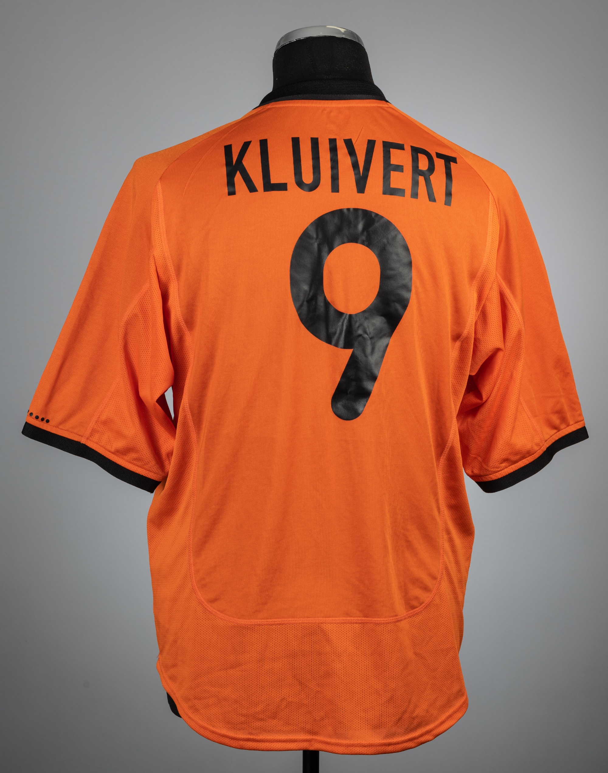 Patrick Kluivert signed orange Netherlands UEFA Euro 2000 no.9 jersey, Nike, short-sleeved with embroidered KNVB national emblem, reverse lettered KL
