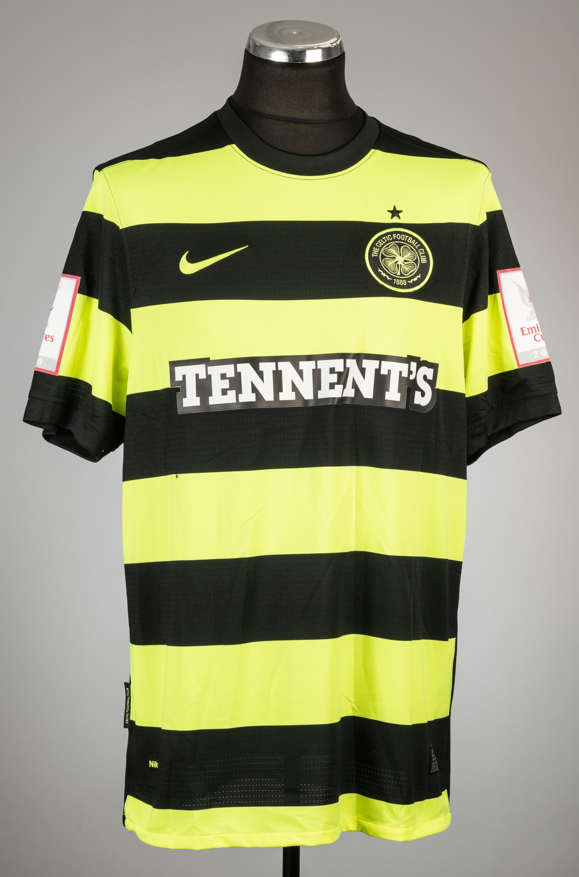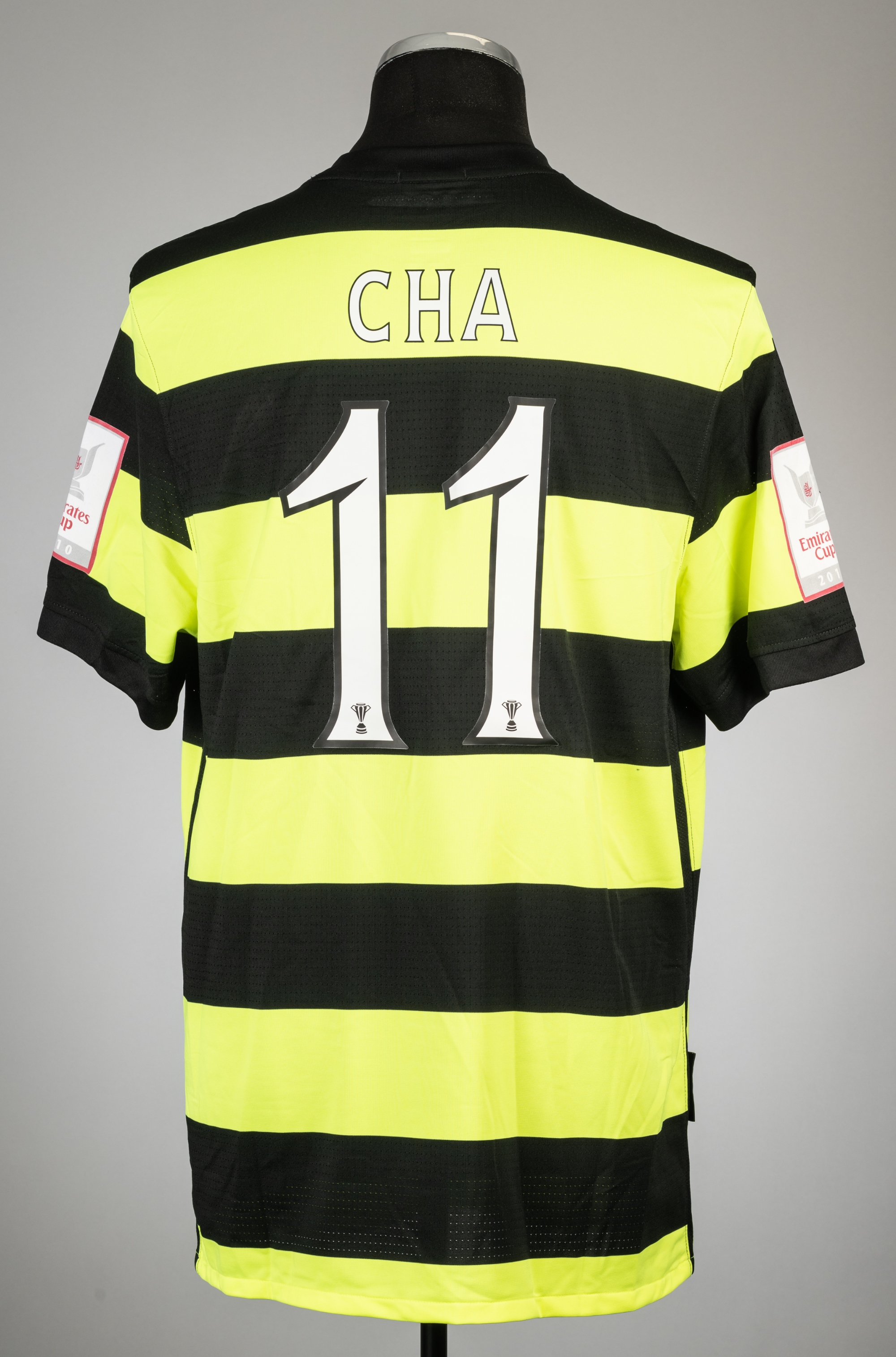 Cha Du-ri yellow and black hooped Celtic Emirates Cup no.11 home jersey, v Arsenal, played at Emirates Stadium, 1st August 2010, Nike, short-sleeved with EMIRATES CUP 2010 sleeve badges, club crest and sponsor logo, reverse lettered CHA, size L Arsenal defeated Celtic 3-2 with Cha Du-ri substituted on in the 61st minute wearing a short-sleeved jersey.