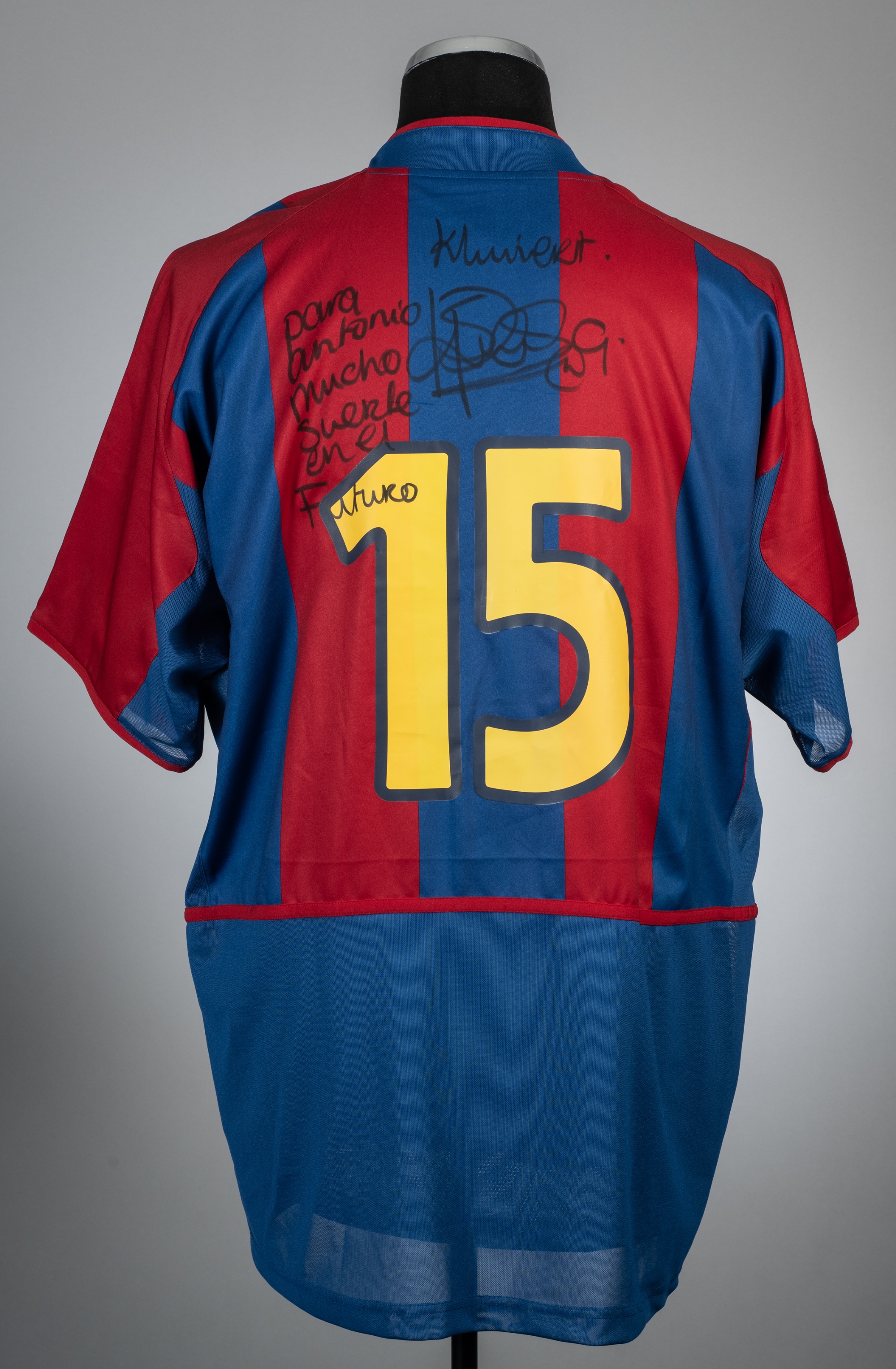 Patrick Kluivert signed red and blue FC Barcelona no.15 jersey in a pre-season friendly v FC Lausanne-Sport, 28th July 2002, Nike, short-sleeved, No sleeve badges, club crest and reverse numbered 15, signed and dedicated to Barcelona's Antonio de la Cruz on his leaving of the club, size XL FC Barcelona defeated FC Lausanne-Sport 2-0.