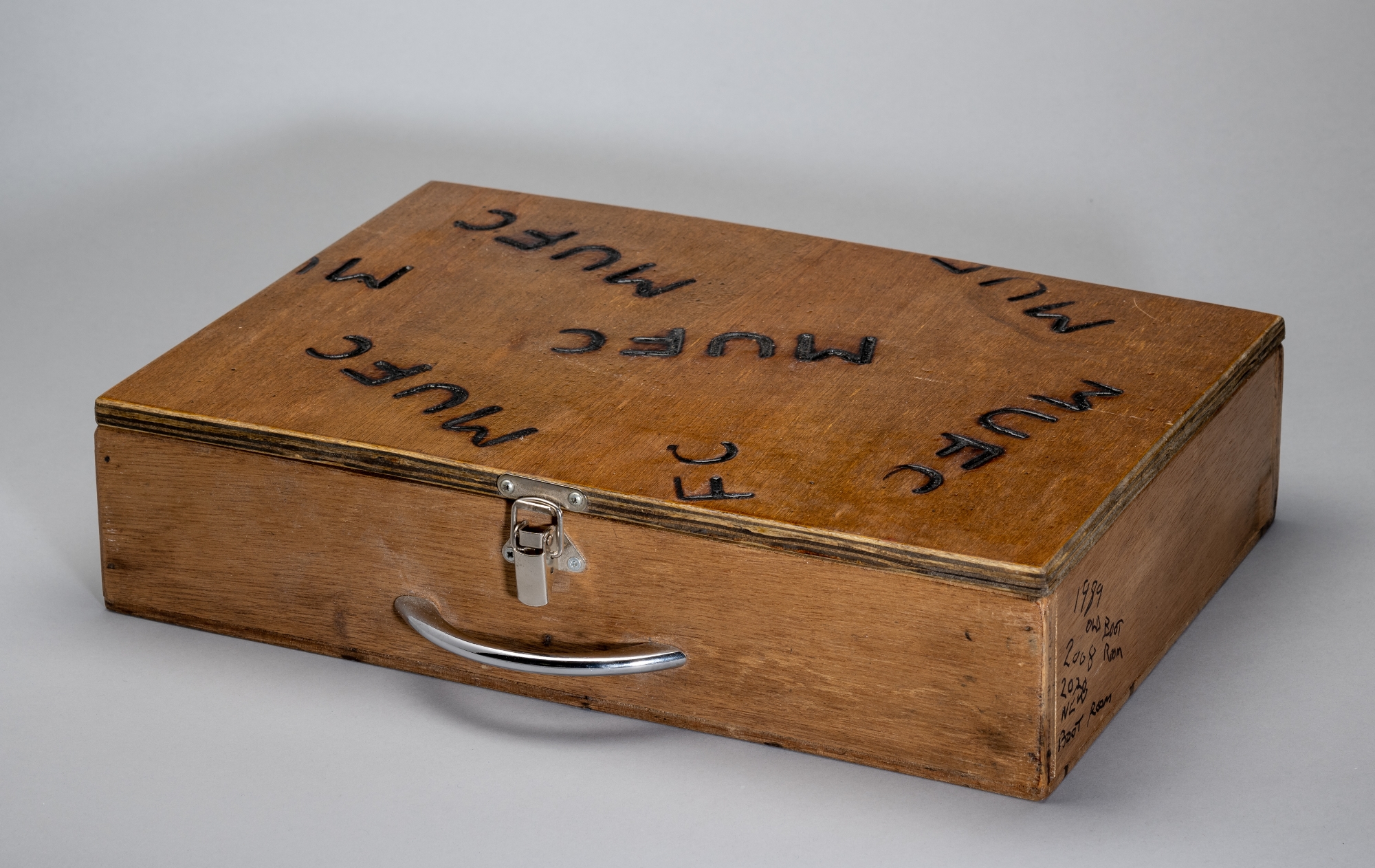 Manchester United's Old Trafford boot room box of first-team boot studs, circa 1989, wooden box with hinged lid with clasp and handle, with MUFC sten