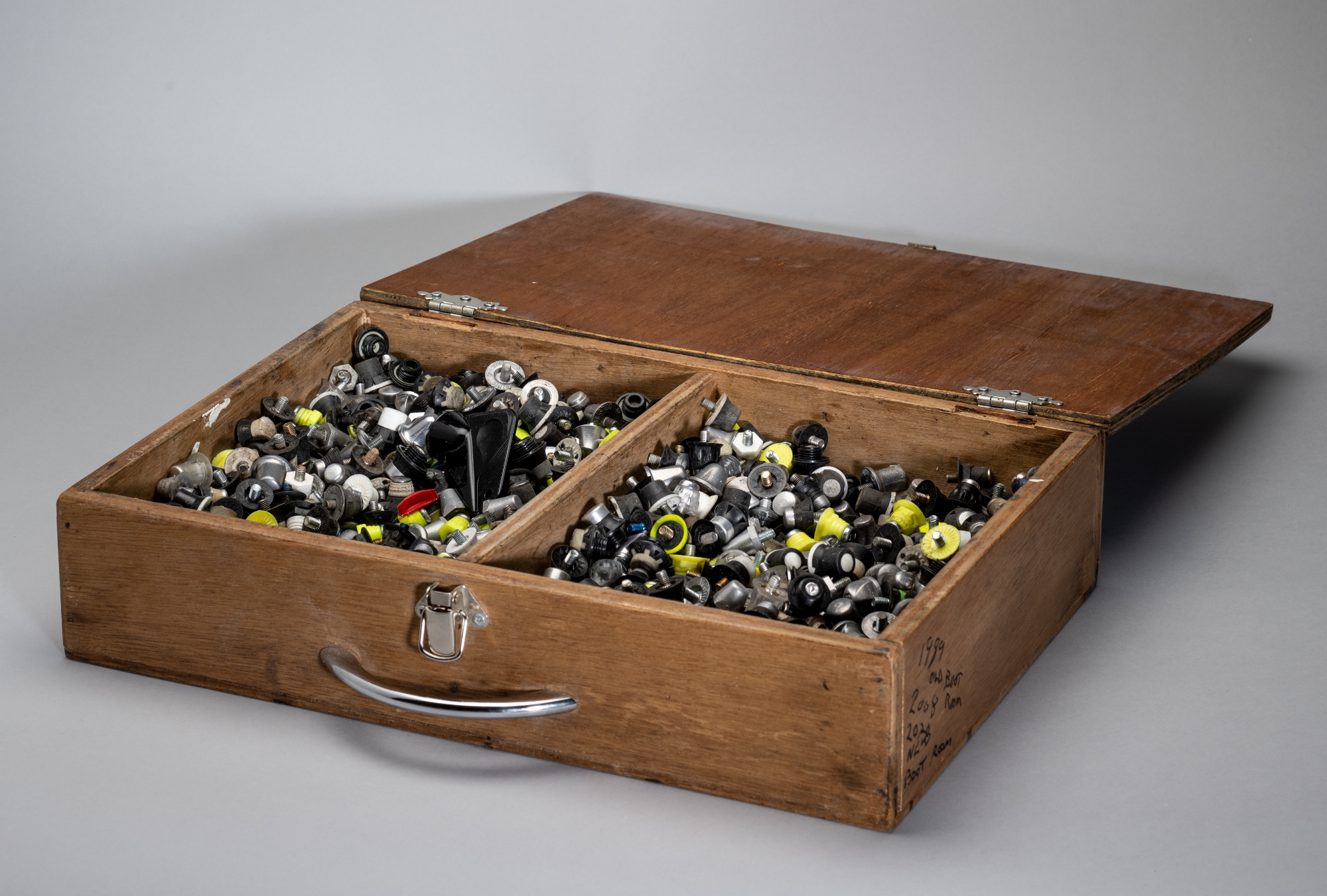 Manchester United's Old Trafford boot room box of first-team boot studs, circa 1989, wooden box with hinged lid with clasp and handle, with MUFC stencilled in pokerwork on lid, the interior two section containing metal, metal and plastic studs, possibly used by some Manchester United legends including Cantona, Beckham, Scholes, Butt etc., various makes, bears black marker pen writing on the side of the box with date 1989, used condition Provenance: the first team studs came out of the boot room from the old dressing rooms at Old Trafford, up the steps in the dug out area, when it was demolished and the new dressing rooms were rebuilt and relocated in North/South corner, the studs went to the New Boot Room until 2020. First team players such as Cantona, Beckham, Scholes and Butt etc. used these types of studs. Provenance: Lester Ellison the Old Trafford dressing room attendant.
